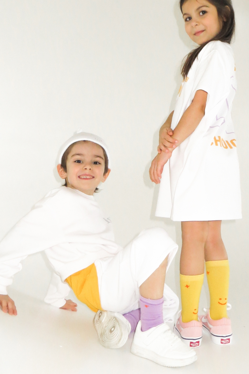 Высокие носки, как идеальное дополнение к образам бренда 1st. Стилизуем их поверх леггинс и джоггеров, перемешиваем цвета в паре, носим как гольфы – вариантов много! Над пяткой мы сделали принт-смайл, который не заметен самому ребенку, но наверняка вызовет беззаботную и мимолетную улыбку у окружающих.
