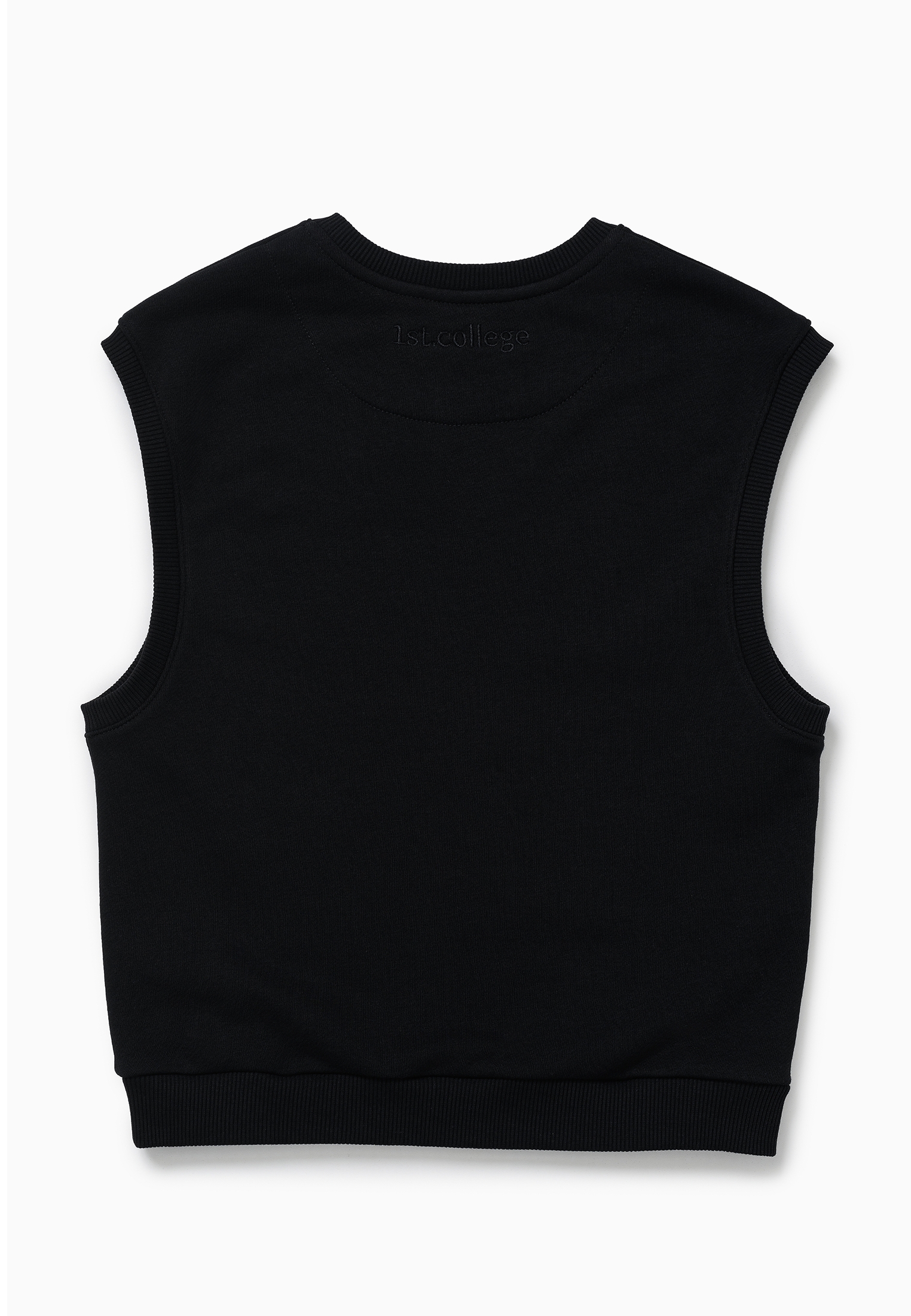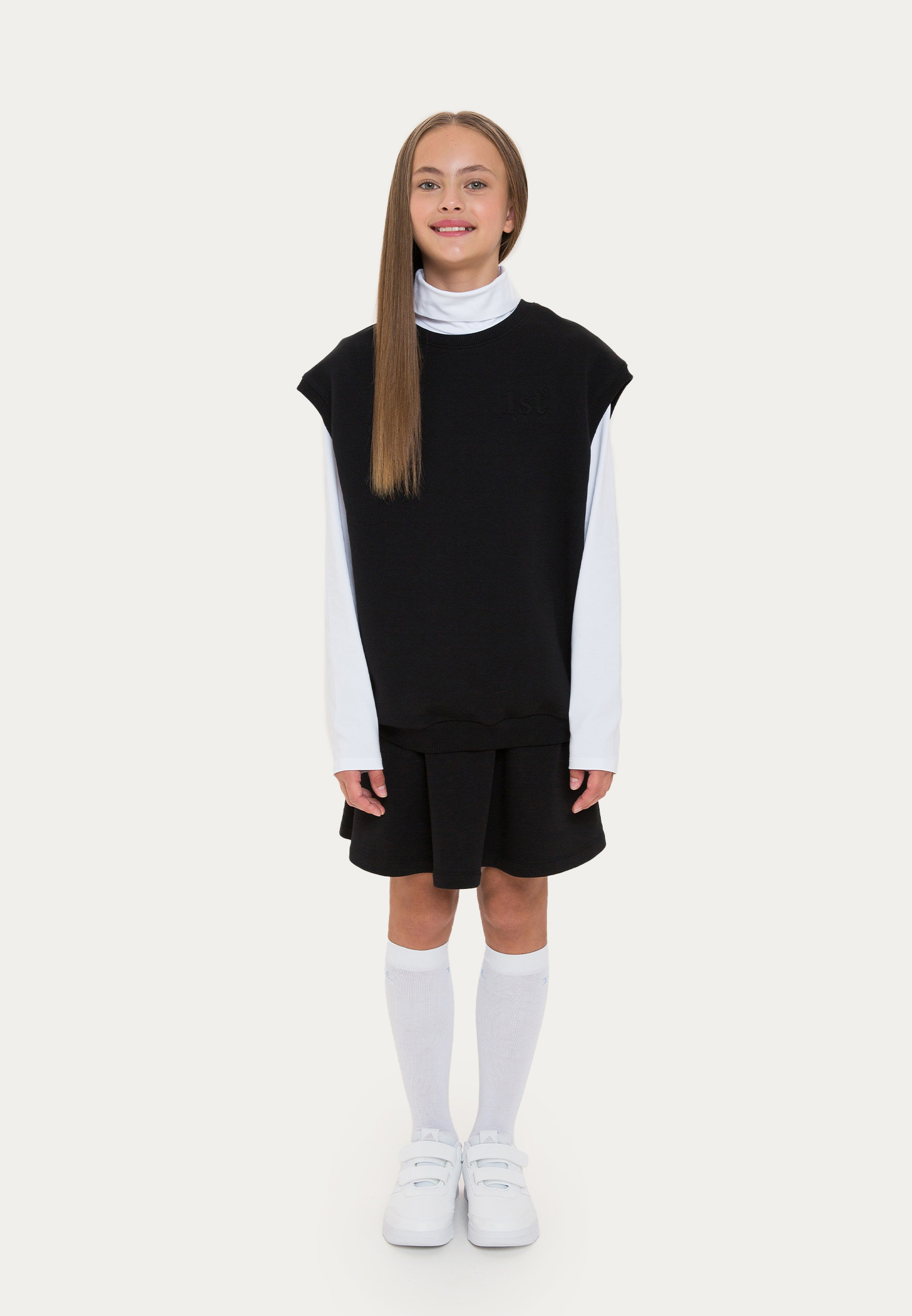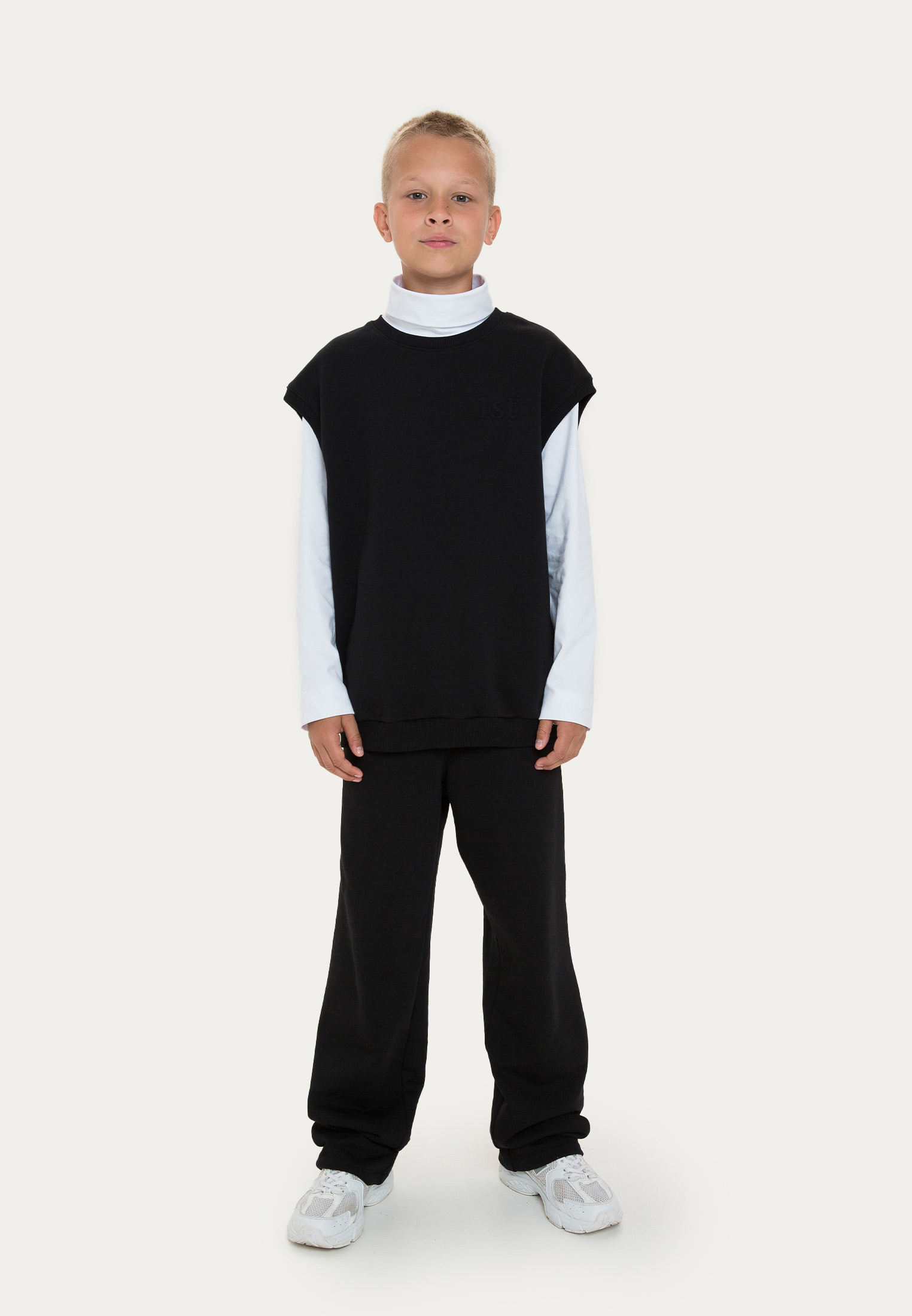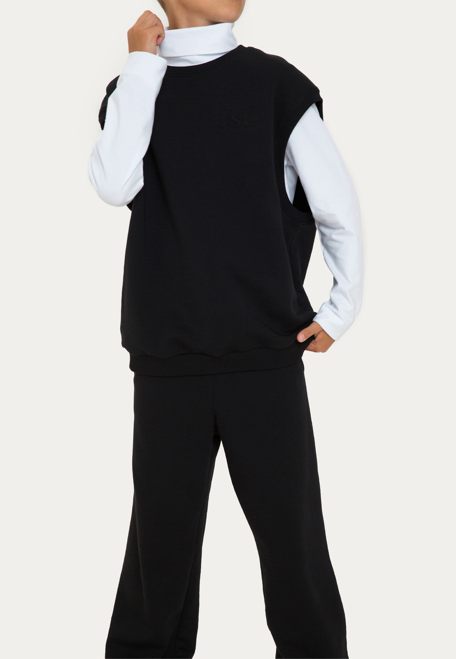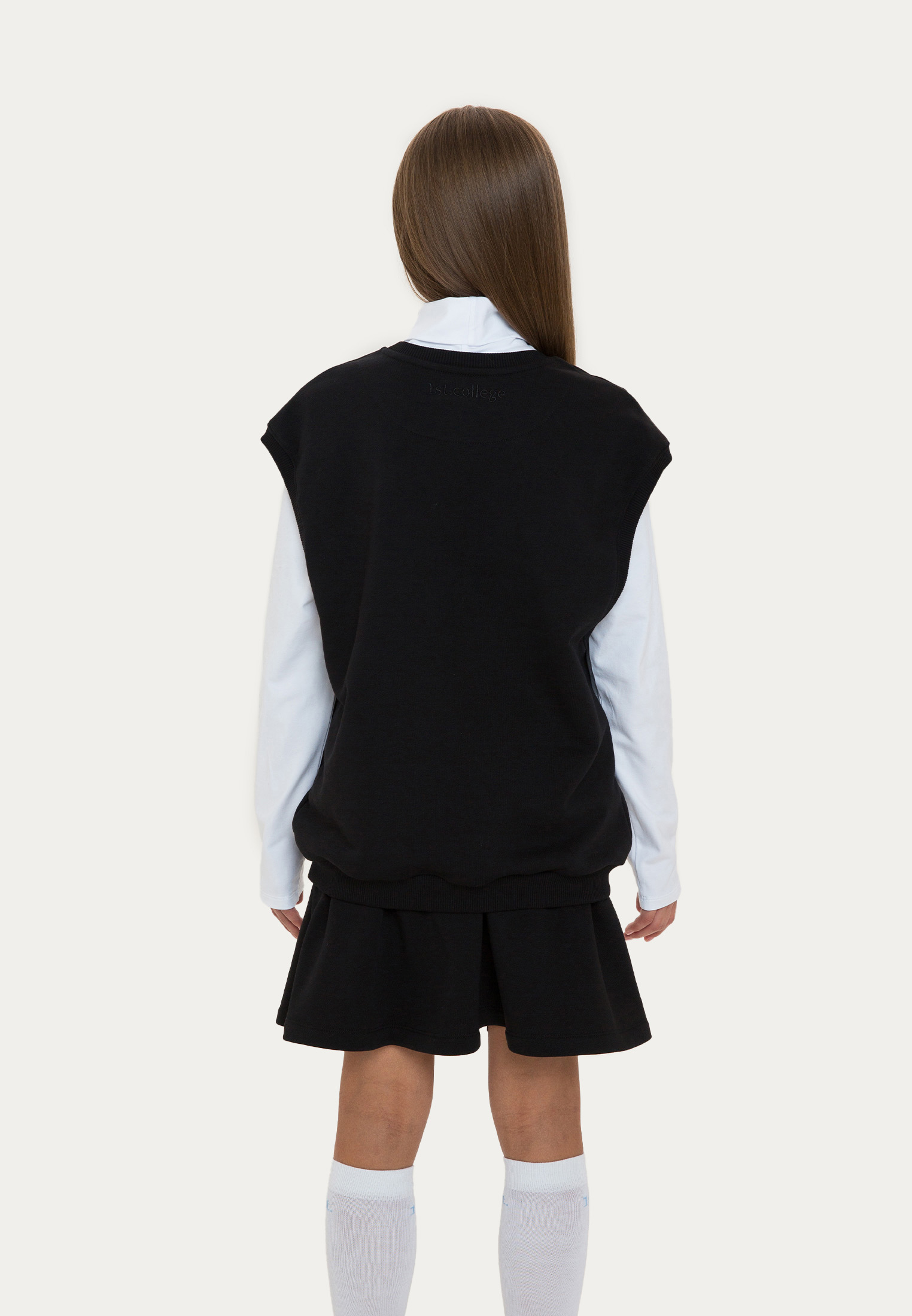 Оверсайз-жилет из футера представлен в темно-синем и черном цветах. Его украшает объемная вышивка в цвет. В процессе конструирования лекал мы учли то, что жилет должен хорошо сочетаться не только с лонгсливами и водолазками, но и объемными рубашками.