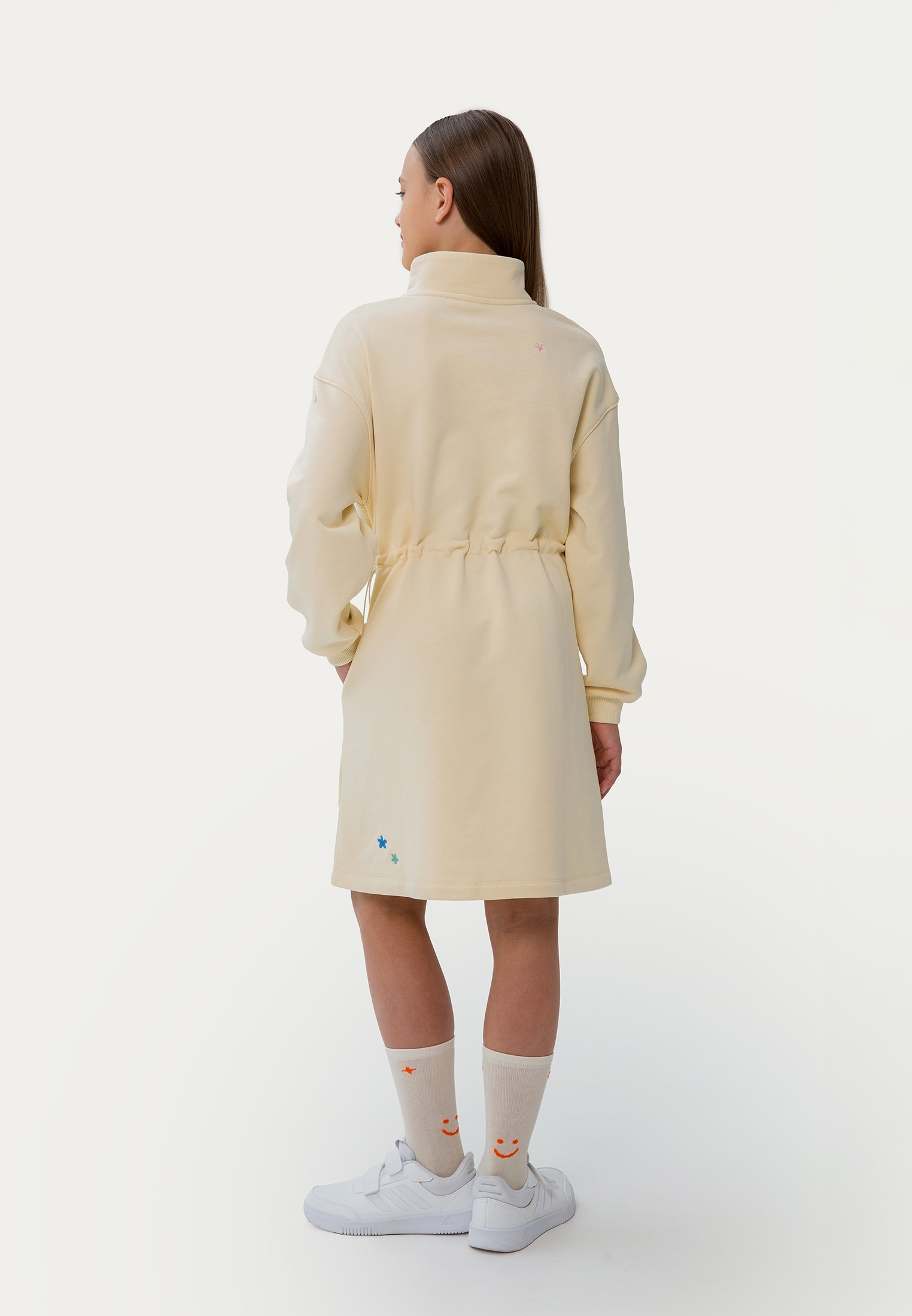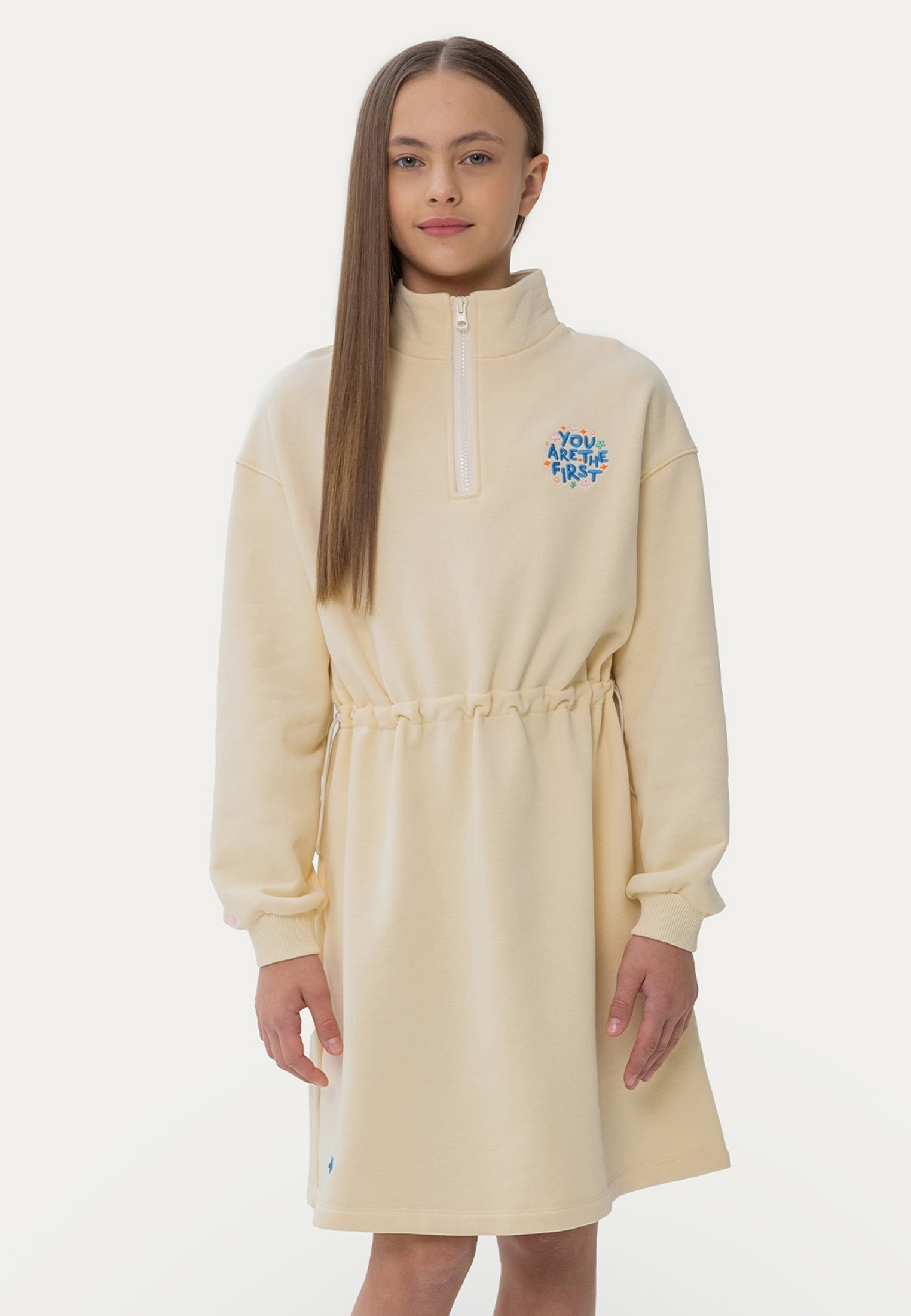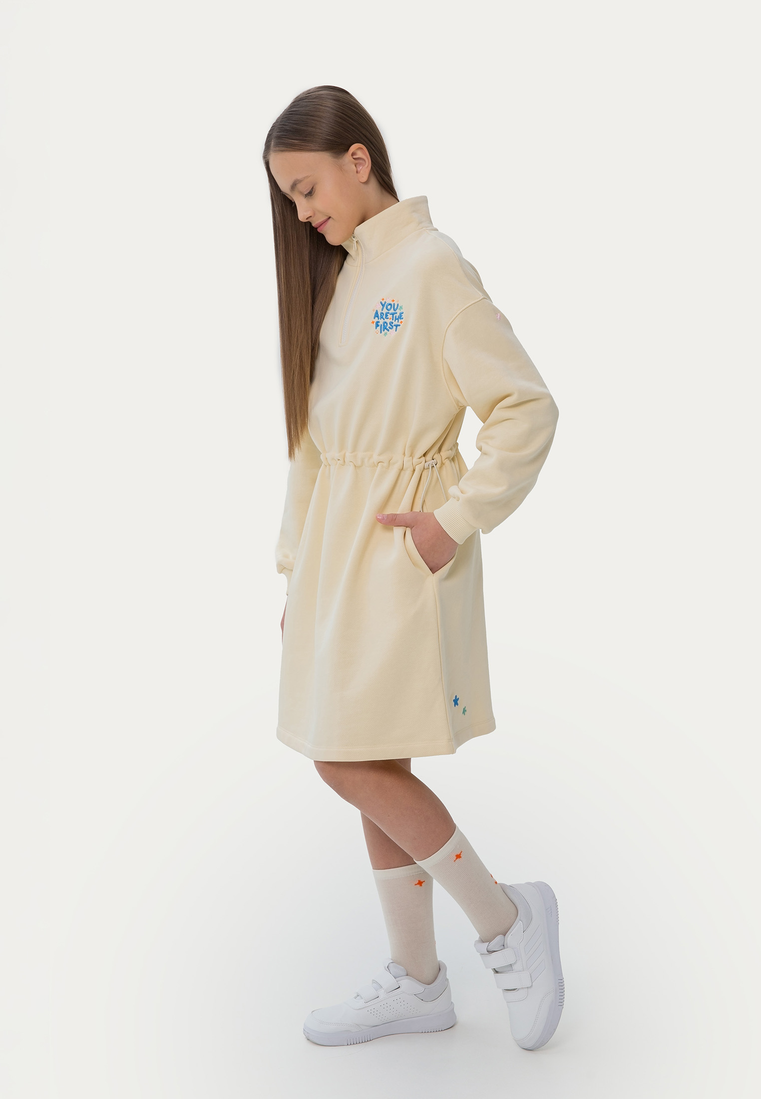 Трикотажное платье из мягкого футера сочетает в себе комфорт и стиль. Идеально подходит как для активных игр, так и для неспешных прогулок. Благодаря удобной длине и крою, оно не сковывает движения, а длинные рукава обеспечат тепло в прохладные дни. Это платье легко адаптируется под любой стиль. Его можно носить как самостоятельный элемент гардероба, а также комбинировать с лосинами или колготками, создавая разнообразные образы.