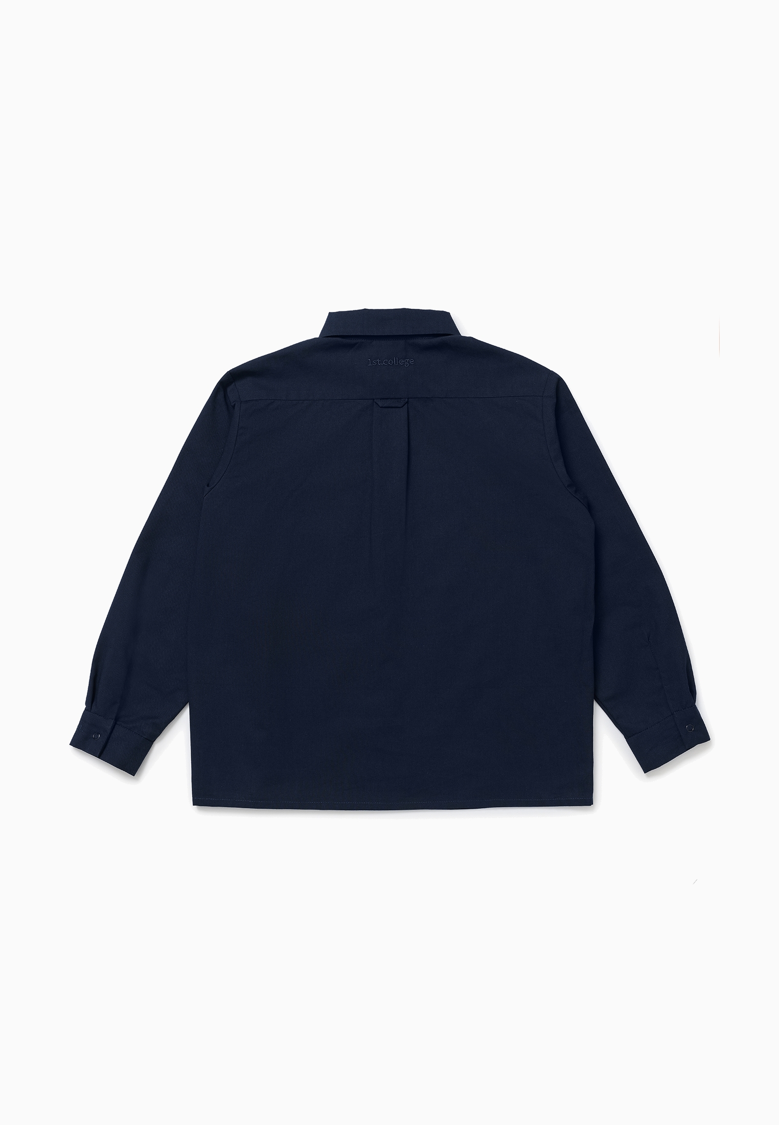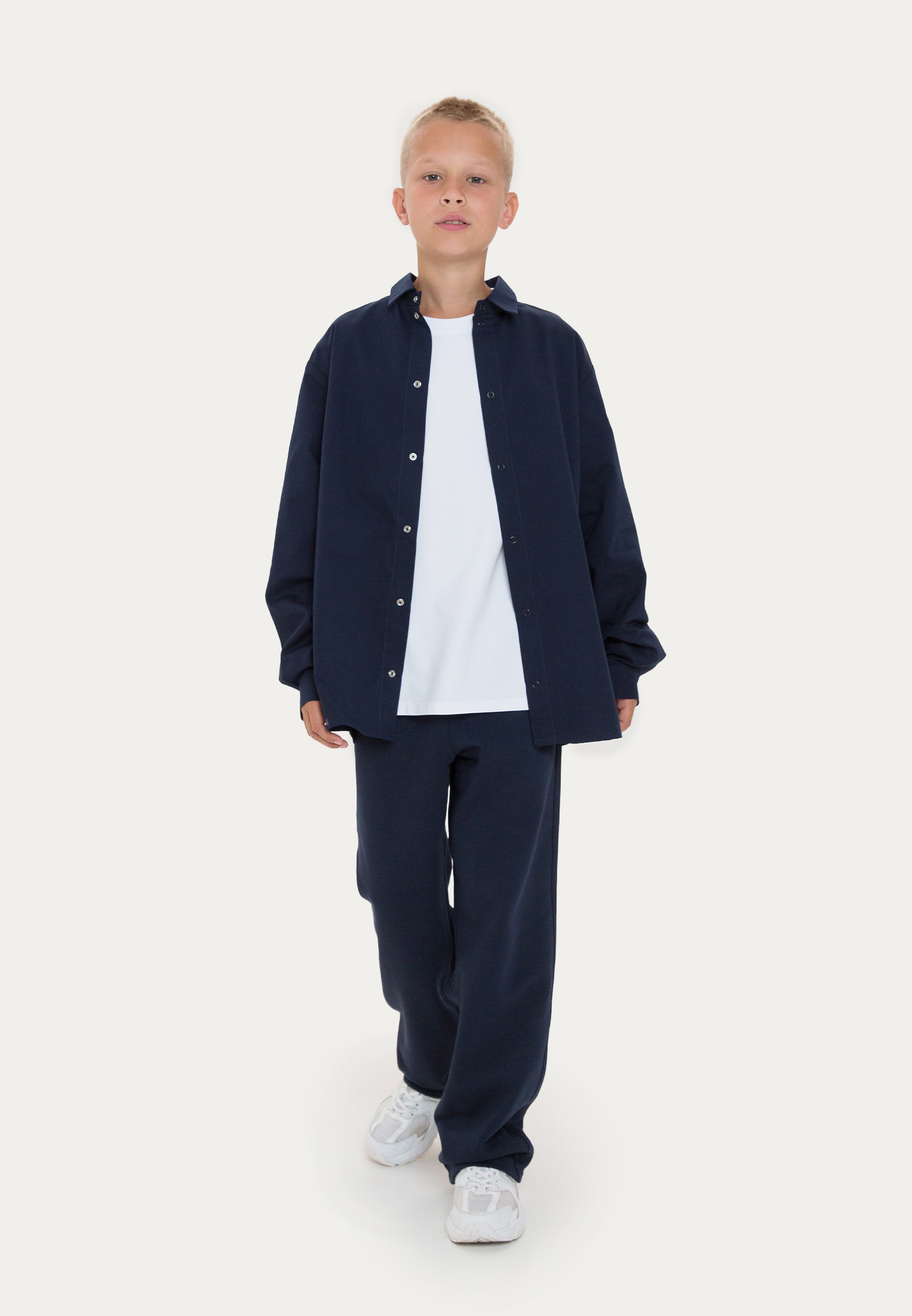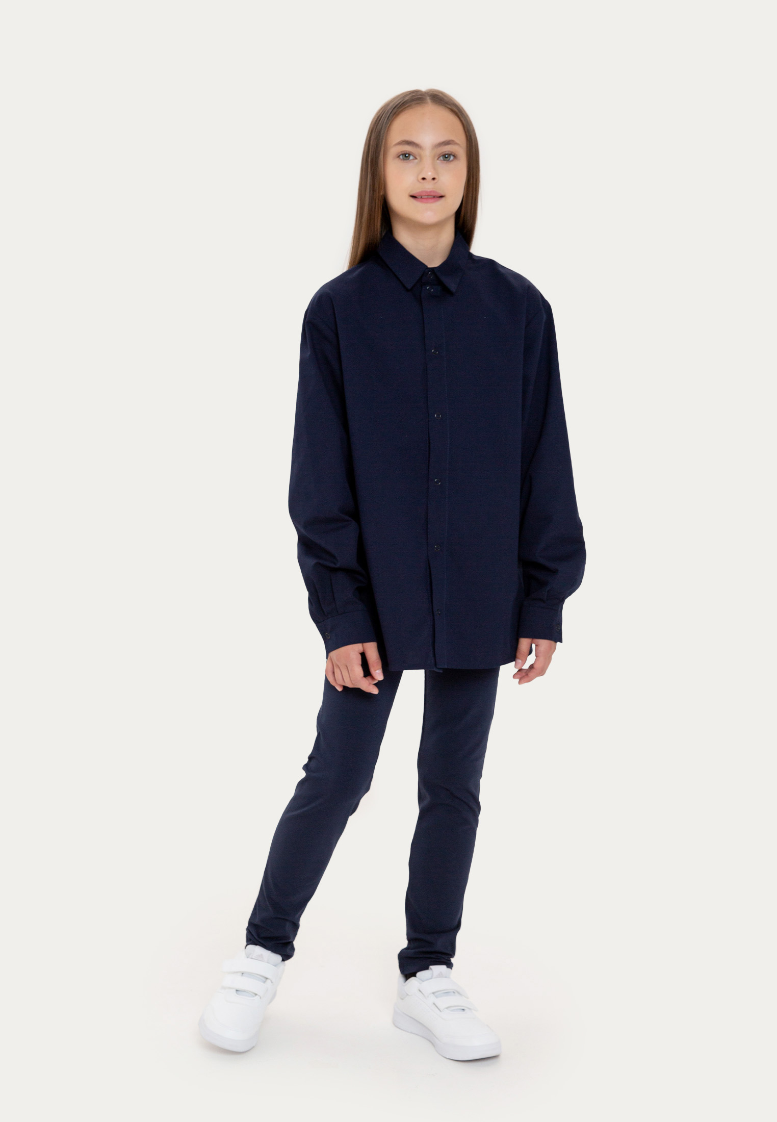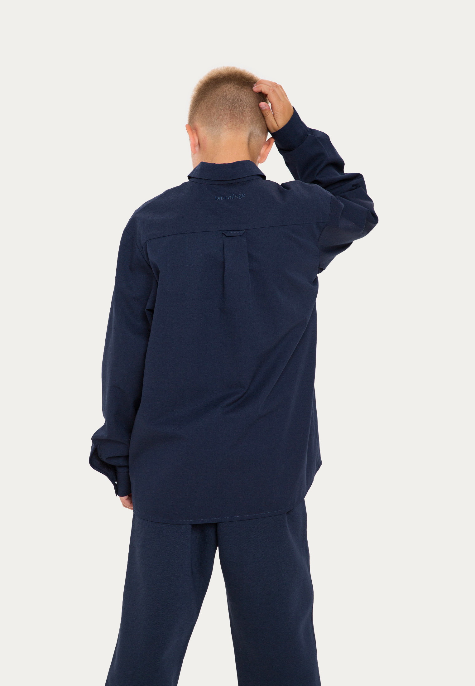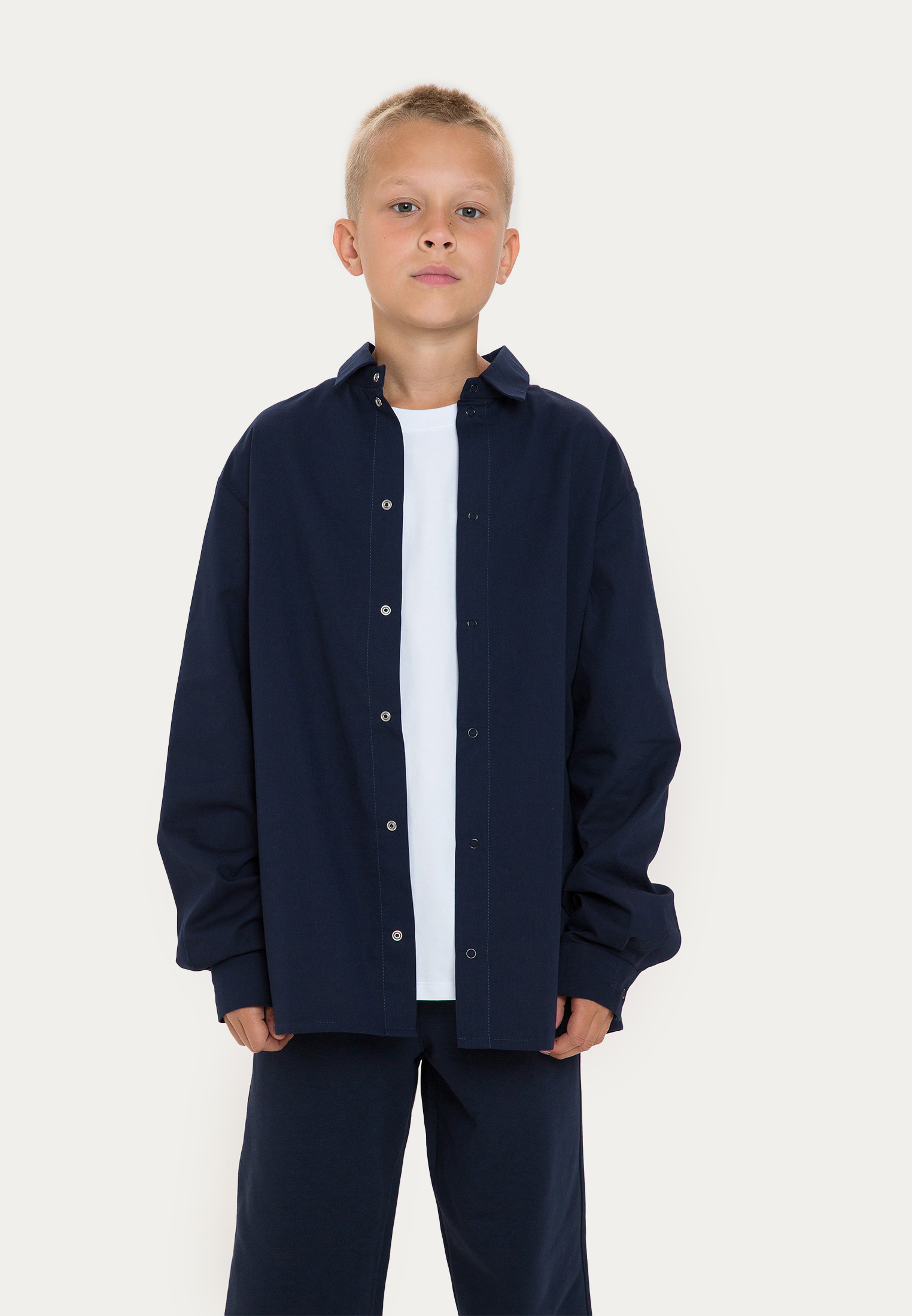 Рубашка для школьной коллекции выполнена из высококачественного материала, в составе которого 70% хлопка и 30% эластана. Преимущество такой ткани в ее долговечности и способности почти не мяться. Дизайн-отдел 1st. намеренно отказался от пуговиц в пользу кнопок, чтобы ребенок мог без труда надевать и снимать рубашку сам. Она выпущена в силуэте оверсайз и прекрасно дополнит лонгсливы и водолазки из школьной капсулы. Модель выполнена в темно-синем цвете и украшена вышивкой в цвет.