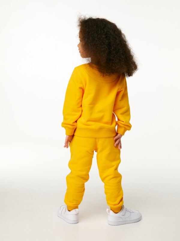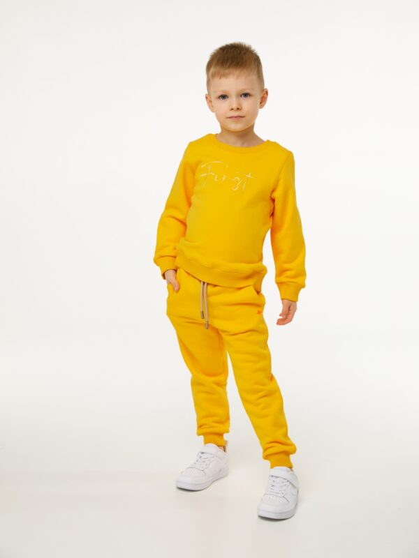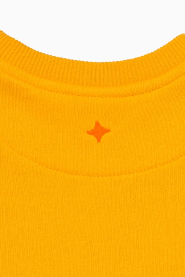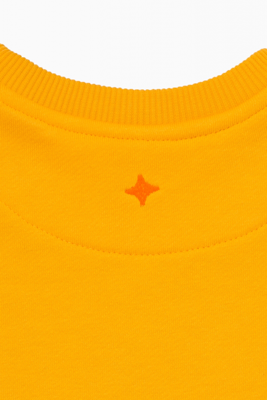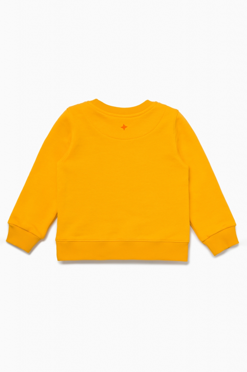 Базовый свитшот классического кроя в цвете манго для мальчика и девочки, выполнен из премиального трикотажа футер петля. Трикотажная резинка в цвет полотна по горловине, низу рукавов и нижнему краю. На фронтальной части изделия выполнена вышивка “First” меланжевыми нитками. На спинке изделия вышита звезда оранжевым цветом.