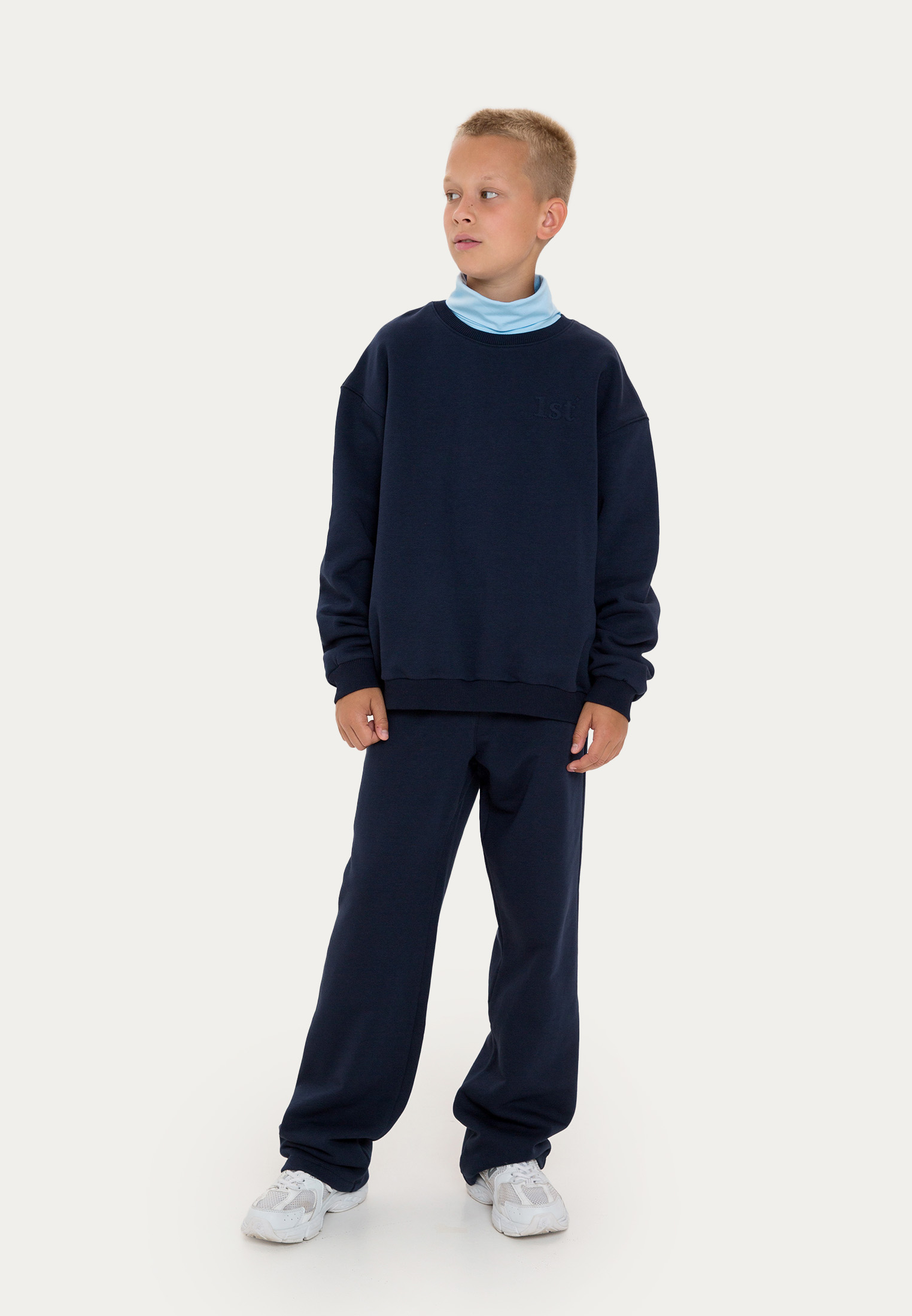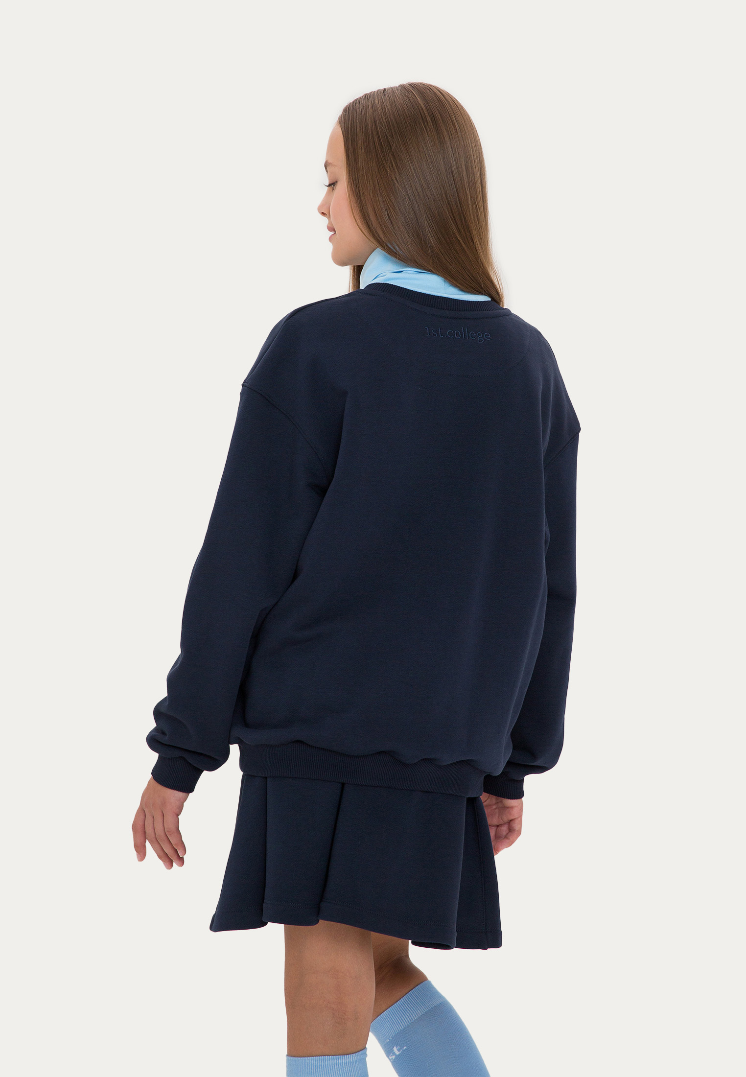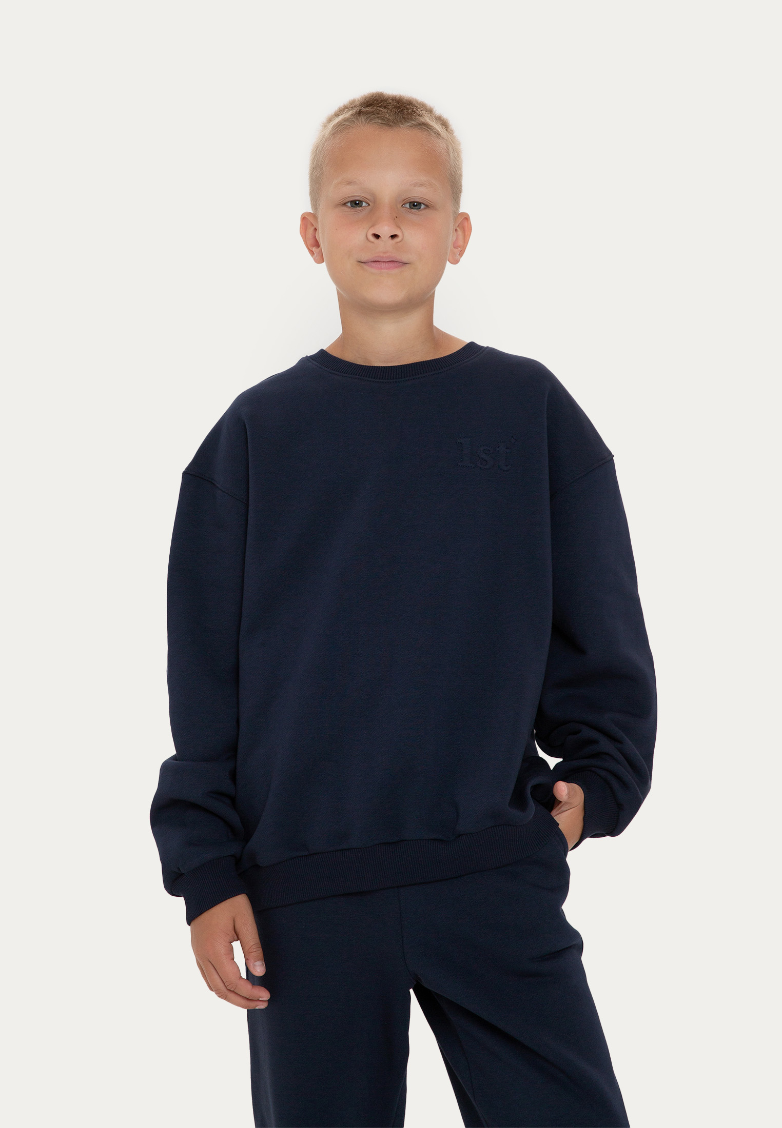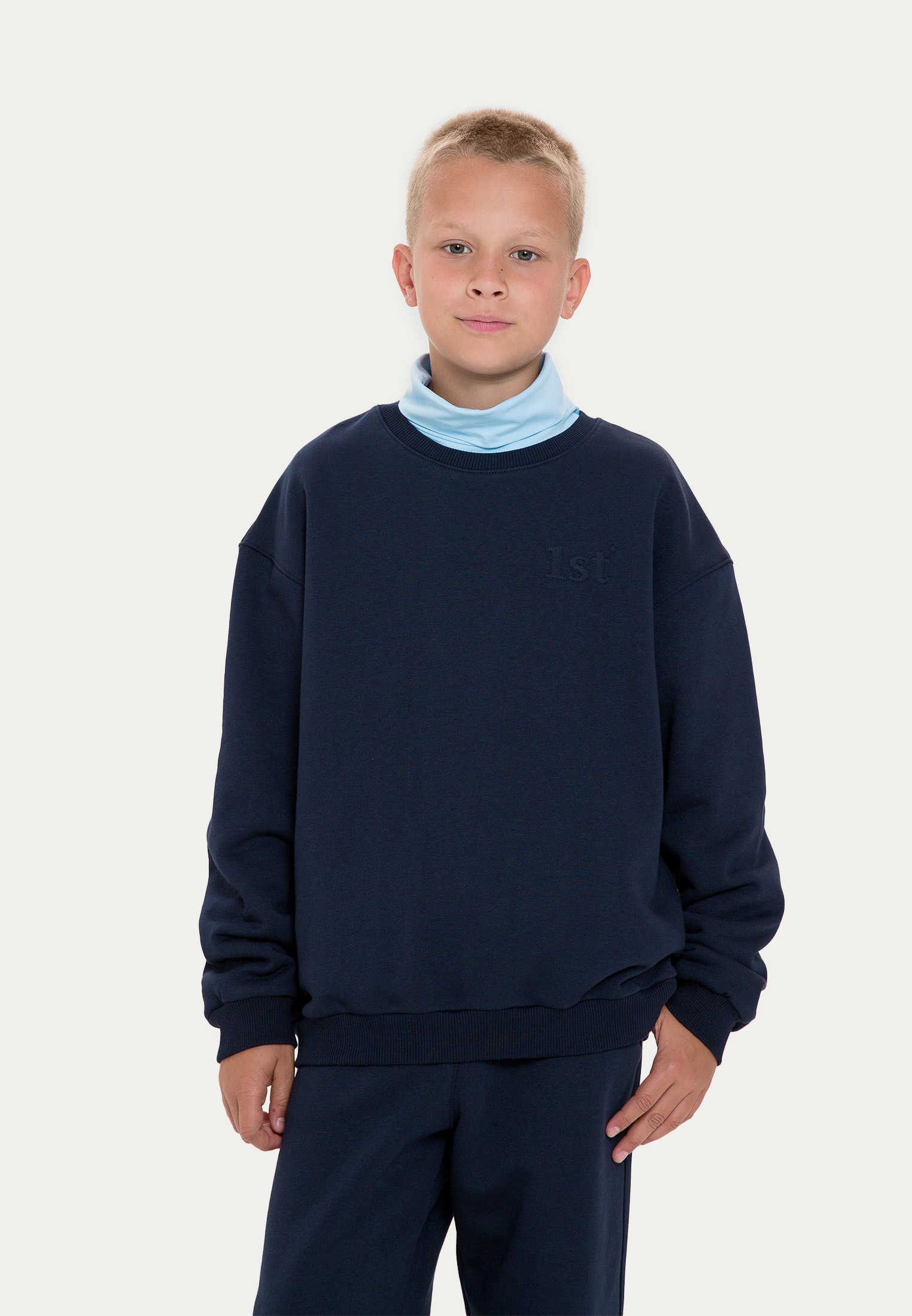 Классическая модель 1st., адаптированная под школьную капсулу. Изделие выполнено из футера в черном и темно-синем цветах и украшено объемной вышивкой в цвет. Благодаря сдвоенному размеру, маленький ученый сможет наслаждаться свитшотом весь учебный год!