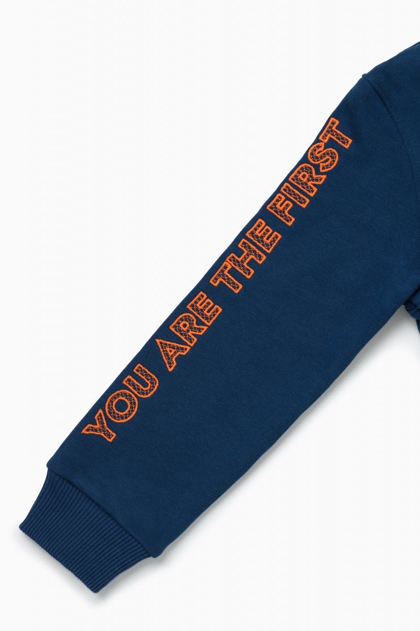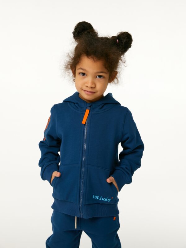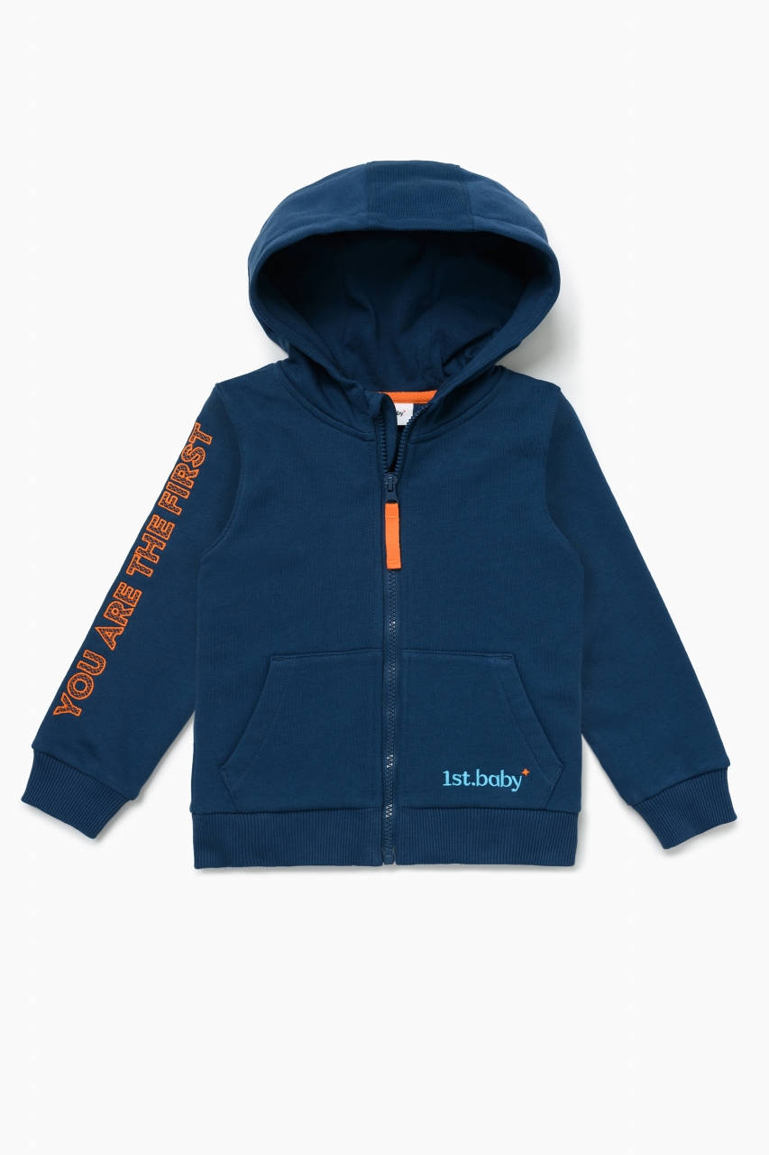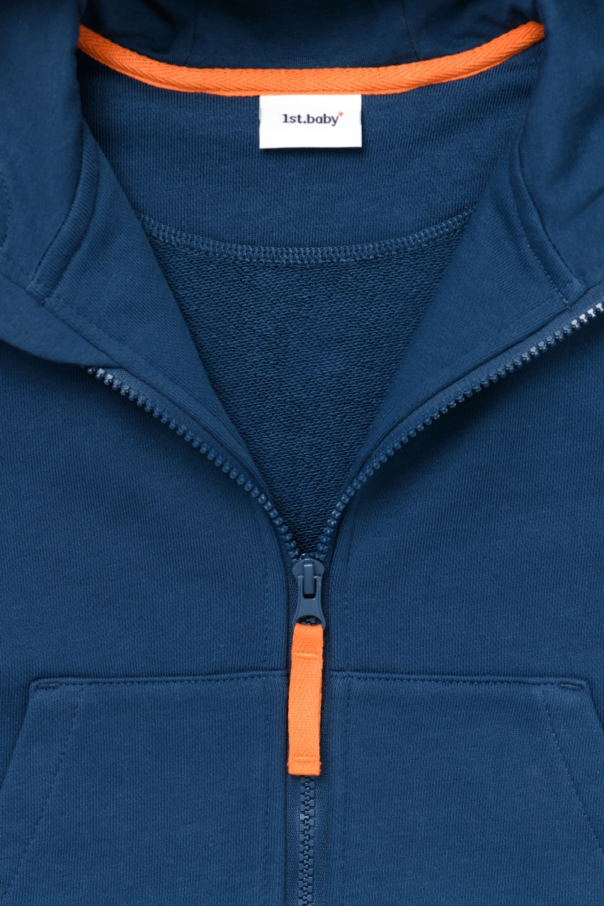 Толстовка с капюшоном в цвете индиго для мальчика и девочки, выполнена из премиального трикотажа футер петля. Классический крой, манжеты рукавов и низ изделия выполнены из трикотажной резинки для защиты от ветра, два удобных кармана спереди с контрастной вышивкой логотипа бренда “1st.baby”, застежка на молнию с защитой подбородка и глубокий капюшон с подкладом из хлопковой ткани. На правом рукаве по длине изделия выполнена вышивка с девизом бренда “YOU ARE THE FIRST”. На спинке изделия вышита звезда оранжевыми нитками.