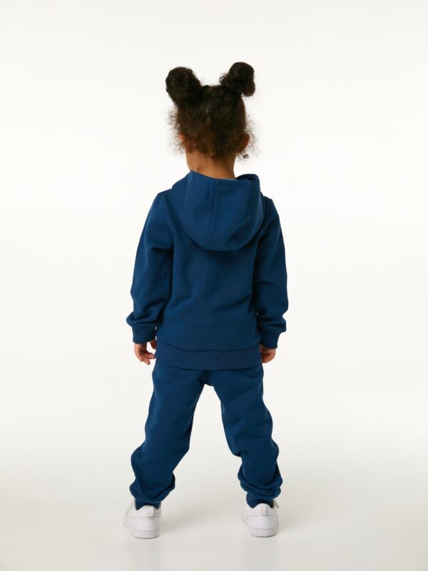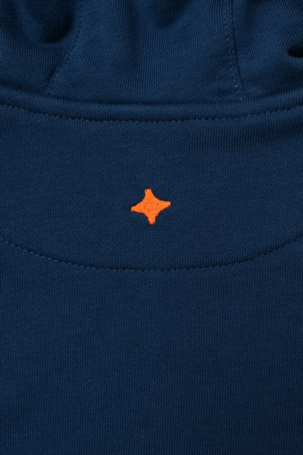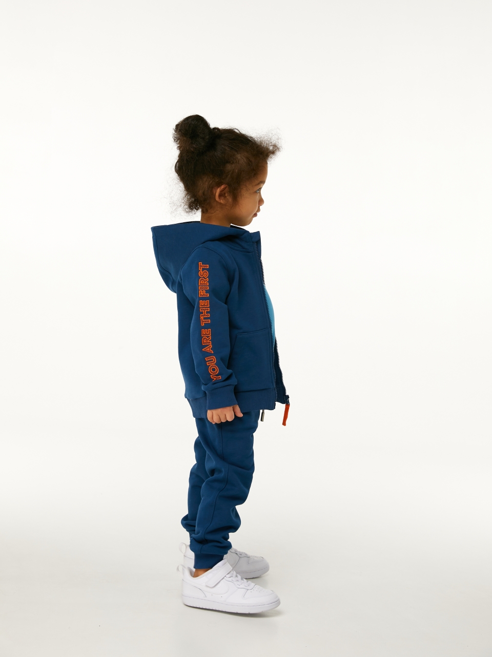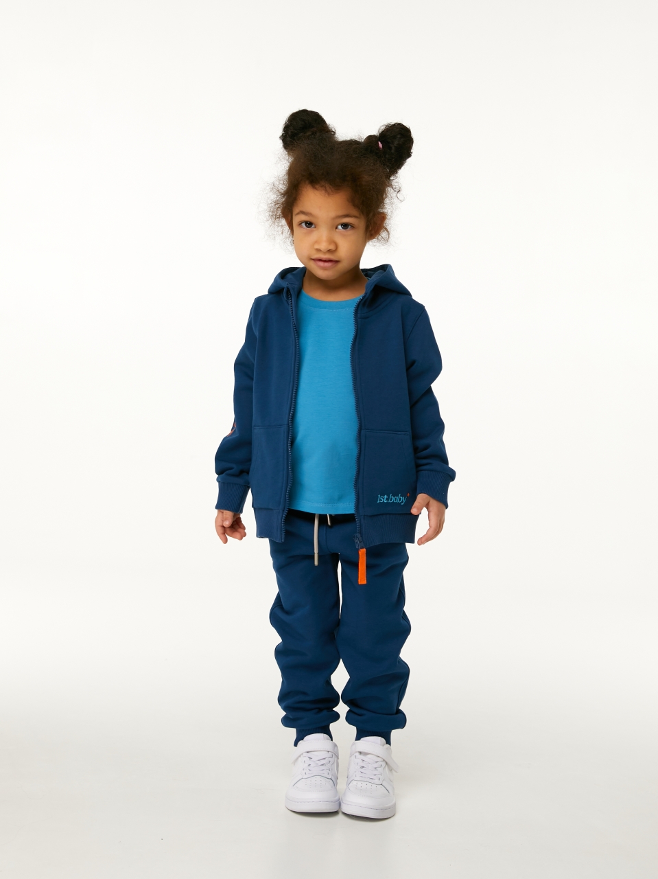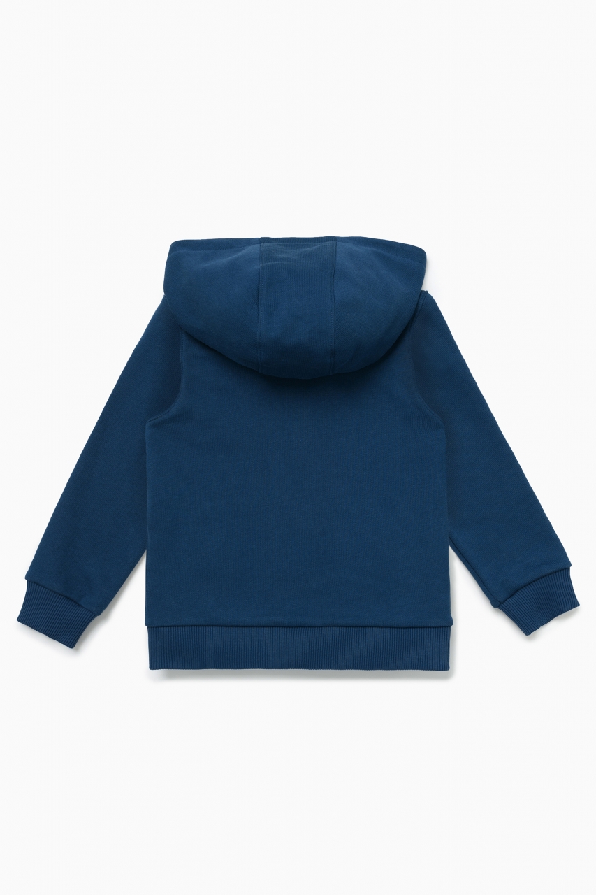 Толстовка с капюшоном в цвете индиго для мальчика и девочки, выполнена из премиального трикотажа футер петля. Классический крой, манжеты рукавов и низ изделия выполнены из трикотажной резинки для защиты от ветра, два удобных кармана спереди с контрастной вышивкой логотипа бренда “1st.baby”, застежка на молнию с защитой подбородка и глубокий капюшон с подкладом из хлопковой ткани. На правом рукаве по длине изделия выполнена вышивка с девизом бренда “YOU ARE THE FIRST”. На спинке изделия вышита звезда оранжевыми нитками.
