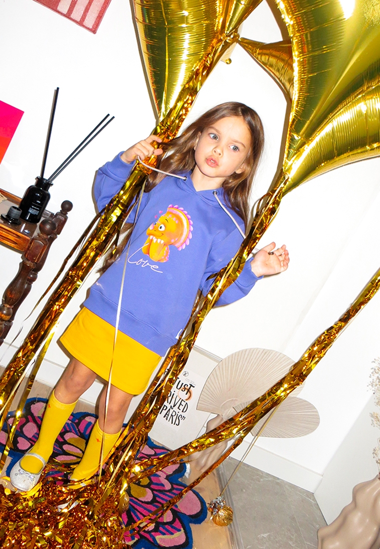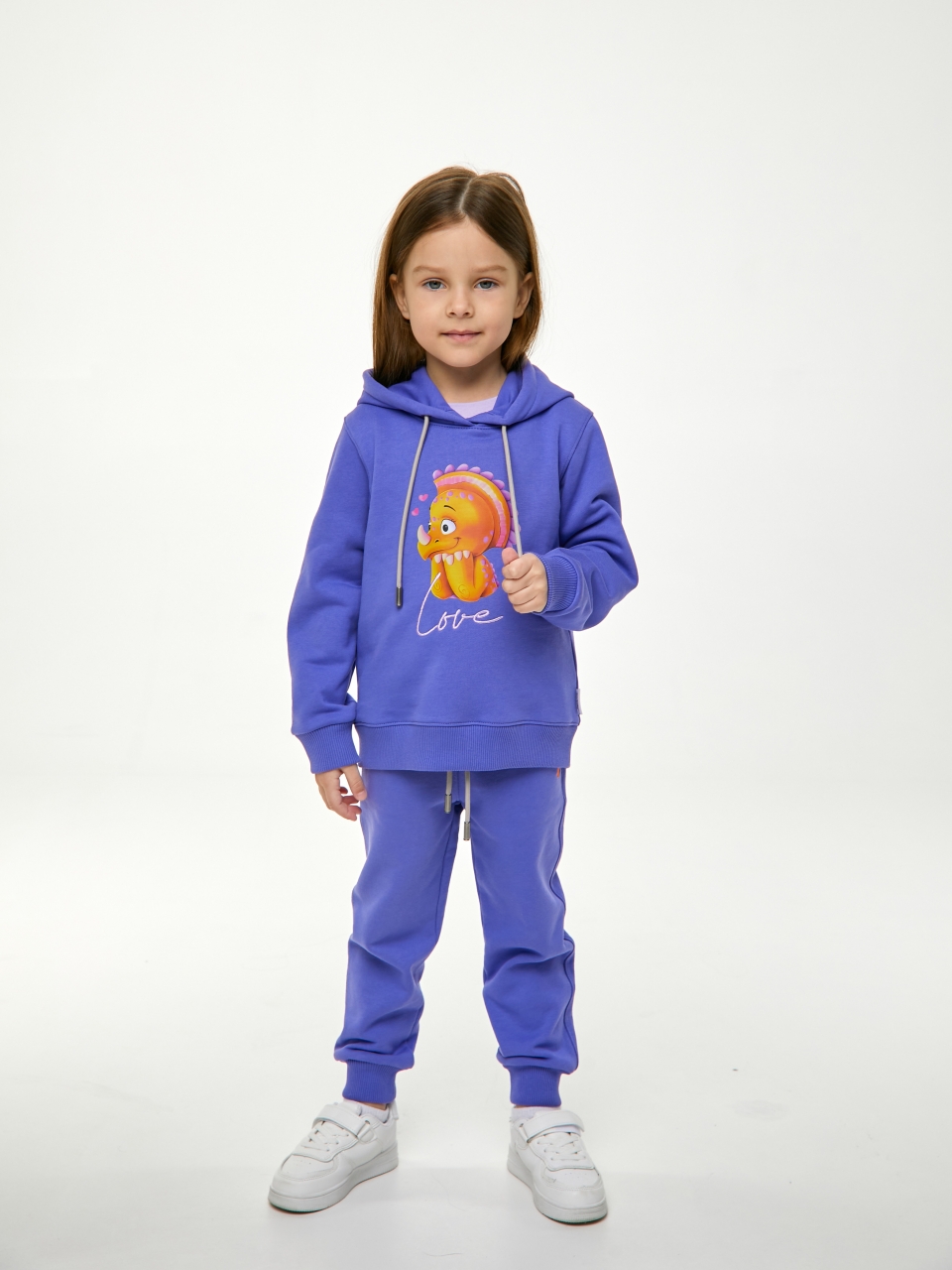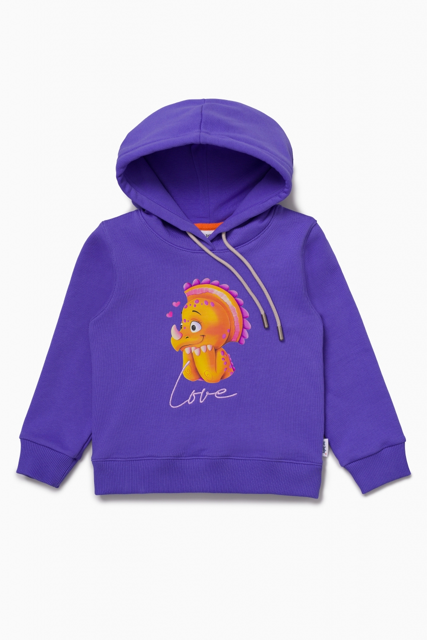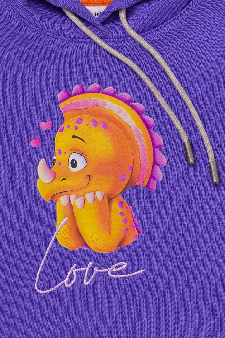 Худи в цвете Very Peri для девочки выполнен из премиального трикотажа футер петля. Классический крой, манжеты рукавов и низ изделия выполнены из трикотажной резинки для защиты от ветра. Глубокий капюшон с подкладом из хлопковой ткани можно регулировать с помощью шнурка. На фронтальной части изделия расположен яркий принт с динозавром и вышивкой “Love” цветными нитками.