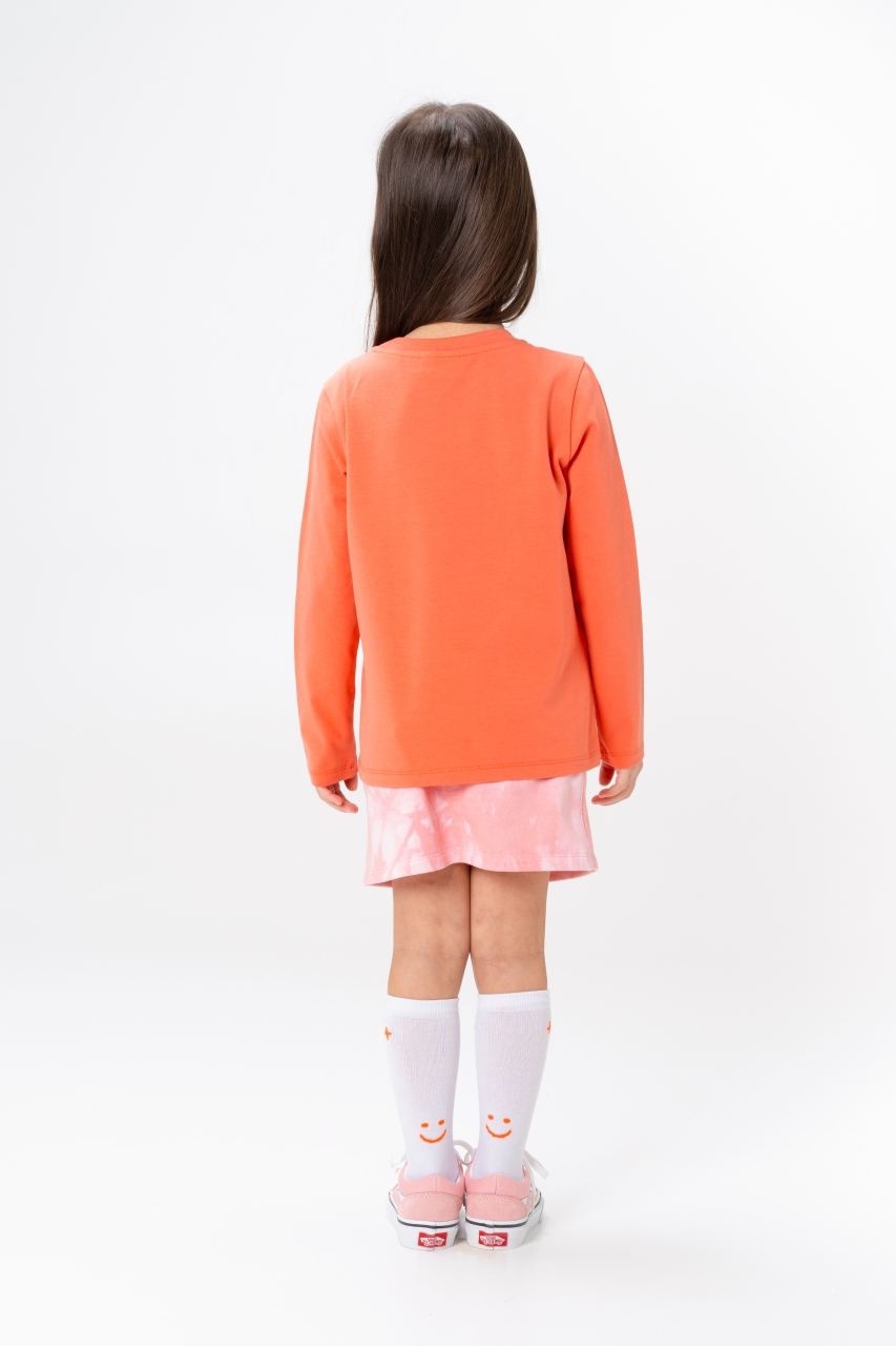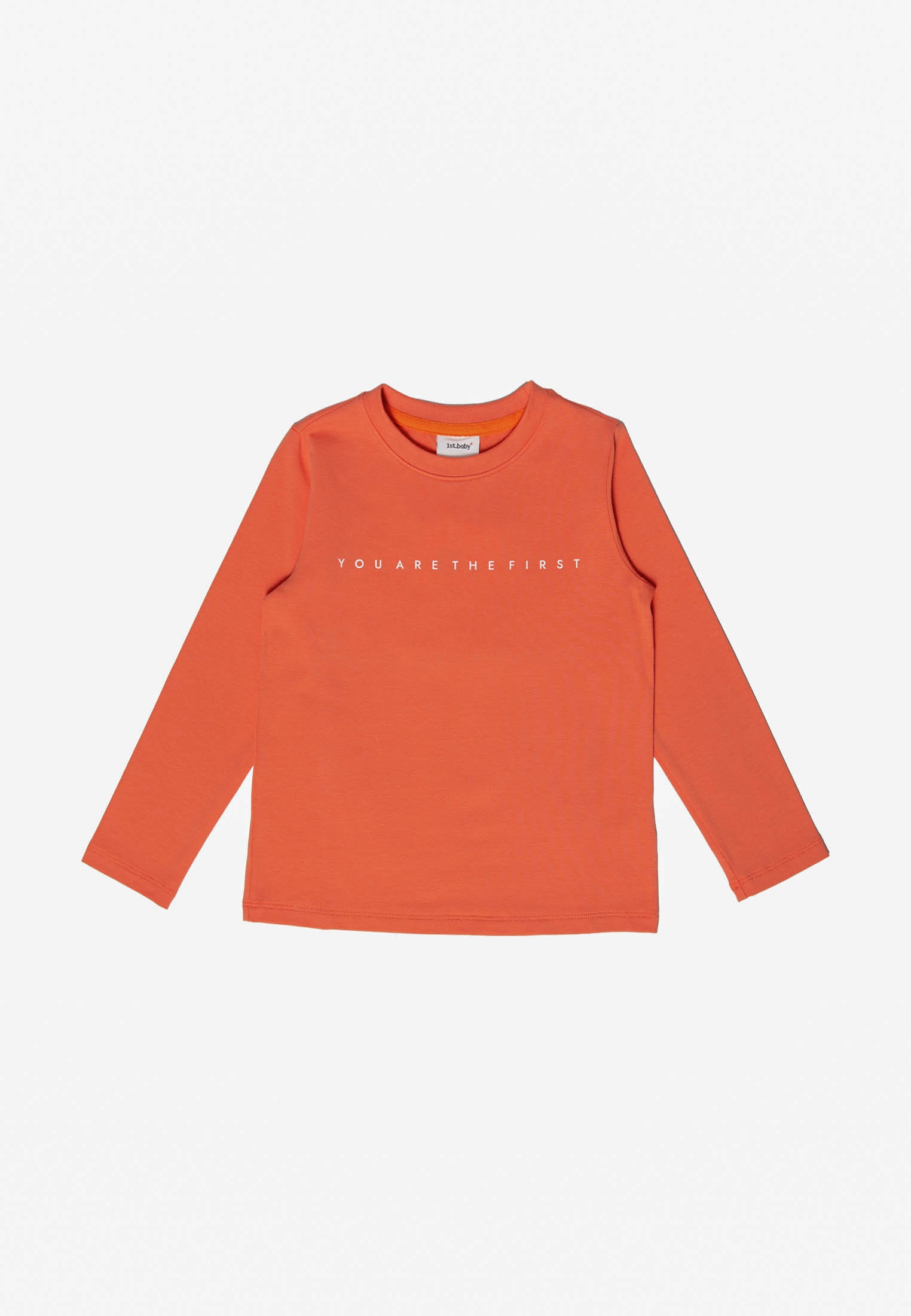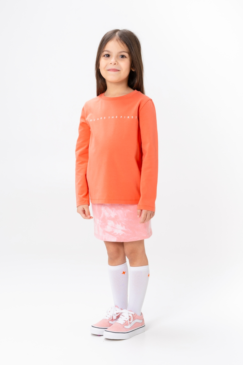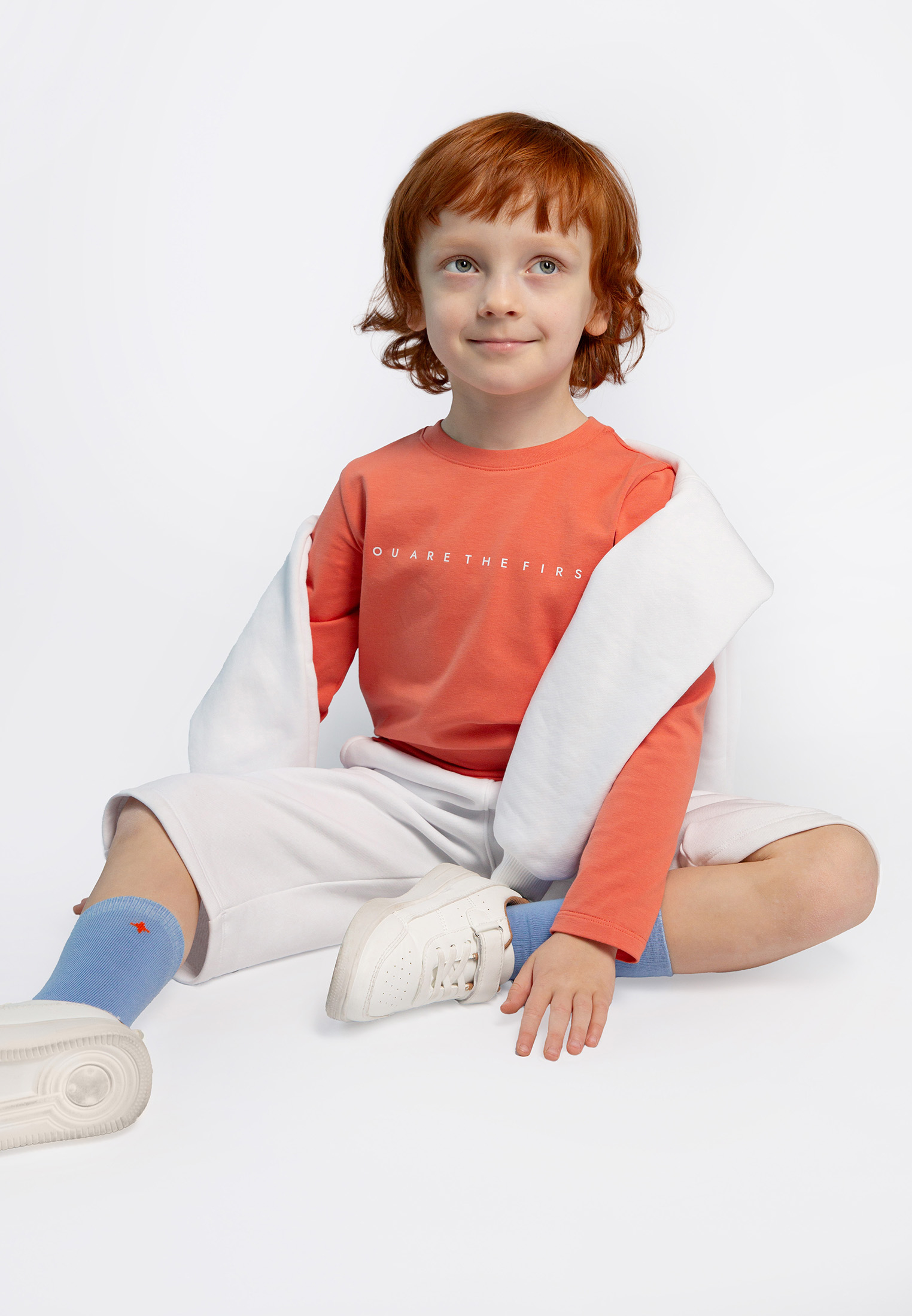 Однотонный лонгслив в цвете гавайский закат свободного кроя для девочки и мальчика. Выполнен из премиального хлопка с добавлением эластана. Материал идеален в носке, не деформируется. Благодаря эластичной горловине лонгслив удобно снимать и надевать. На фронтальной части изделия расположен яркий принт – “YOU ARE THE FIRST”