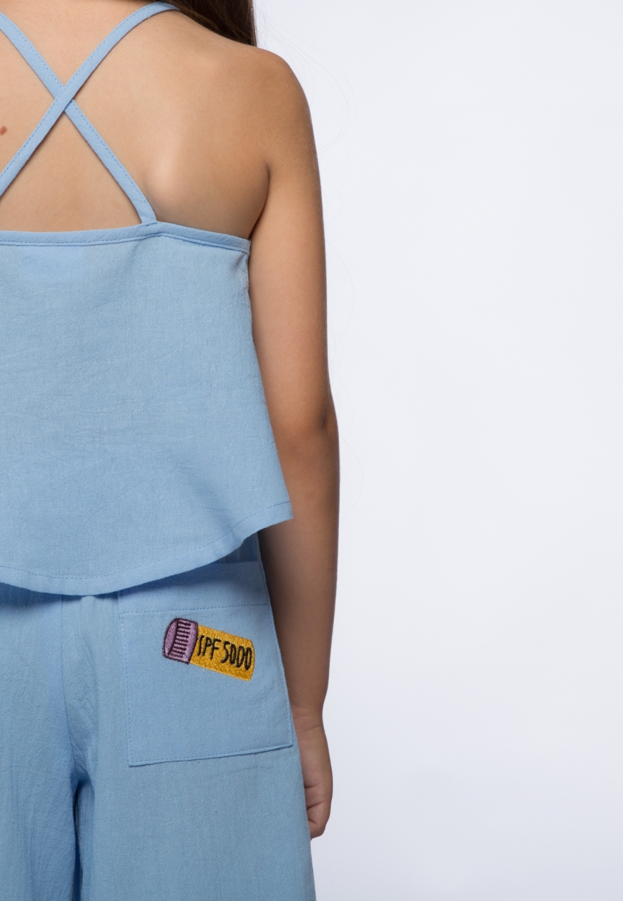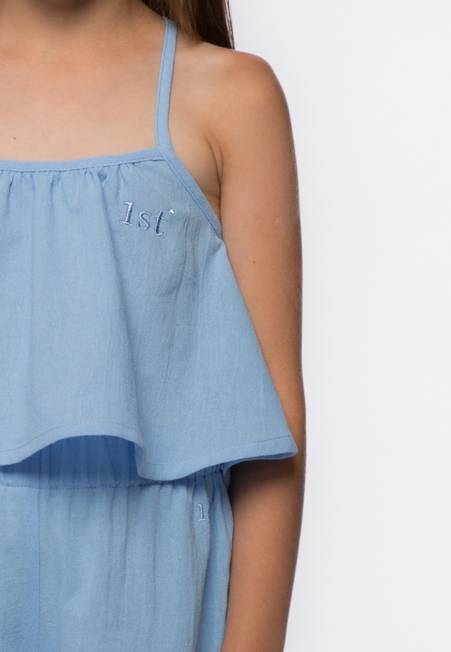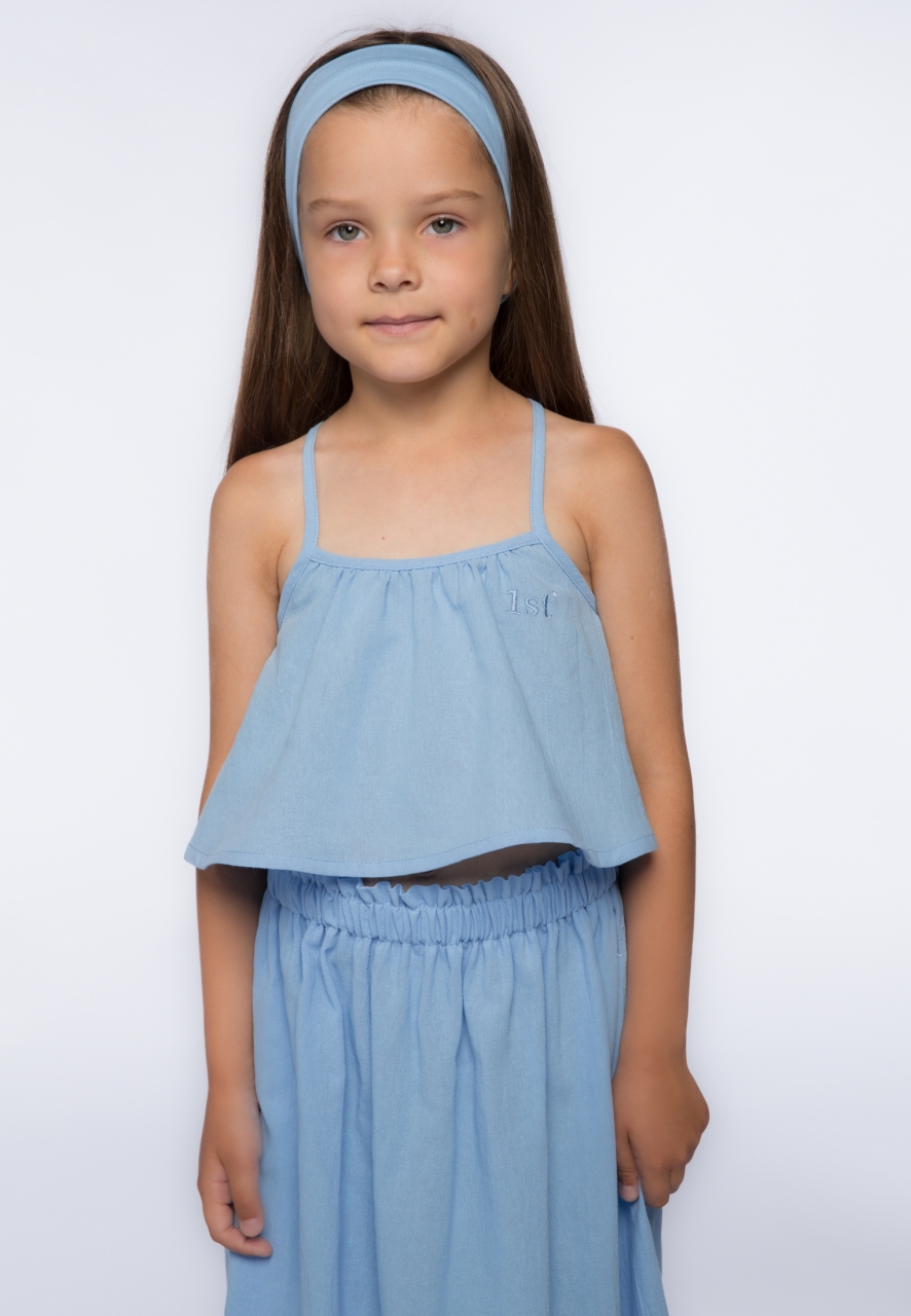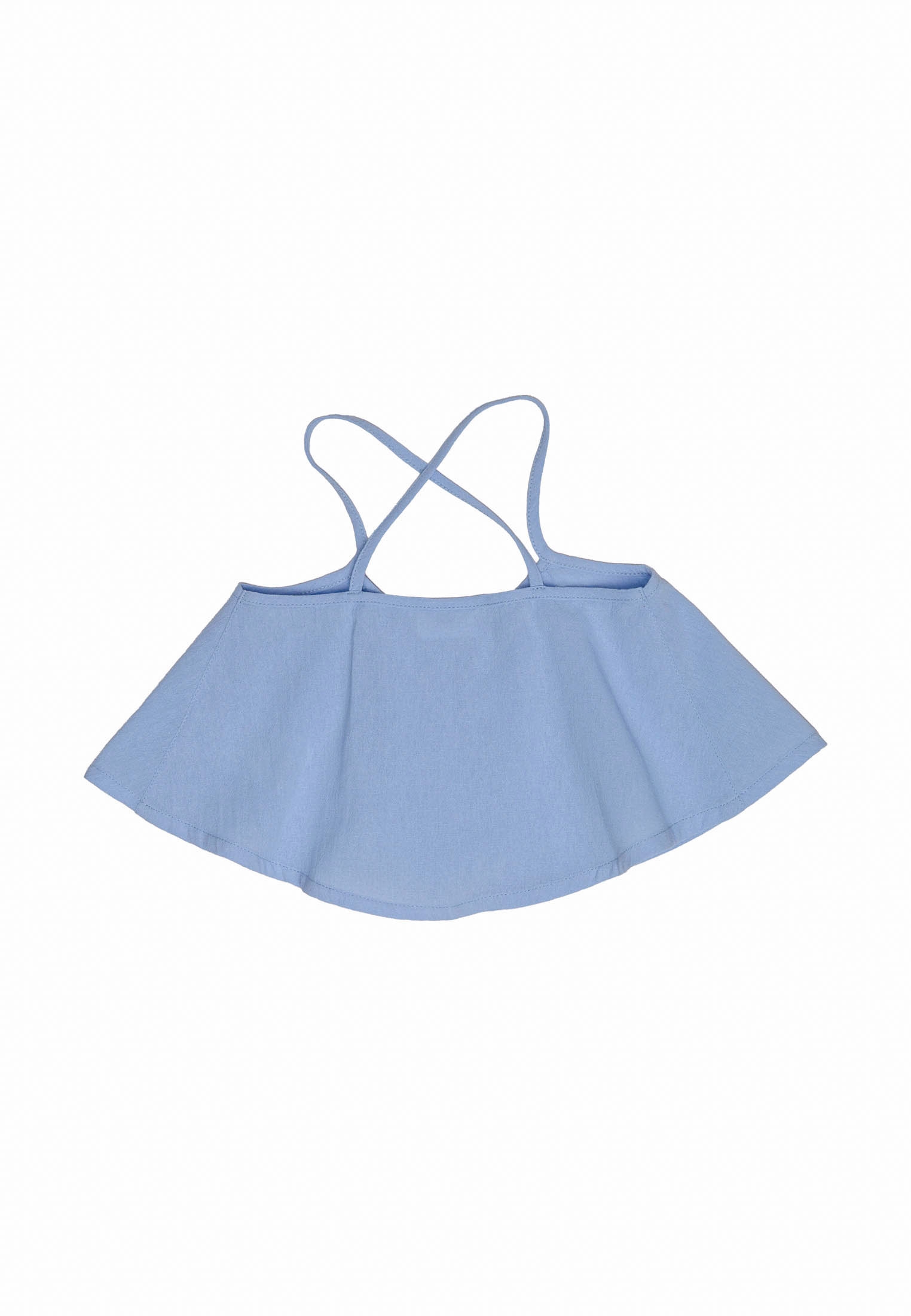 Невесомый топ на тонких бретелях выполнен из легкого хлопка и дополнен вышитым логотипом 1st. в цвет. Выполнен в голубом и черном цветах, а также имеет сдвоенный размер.