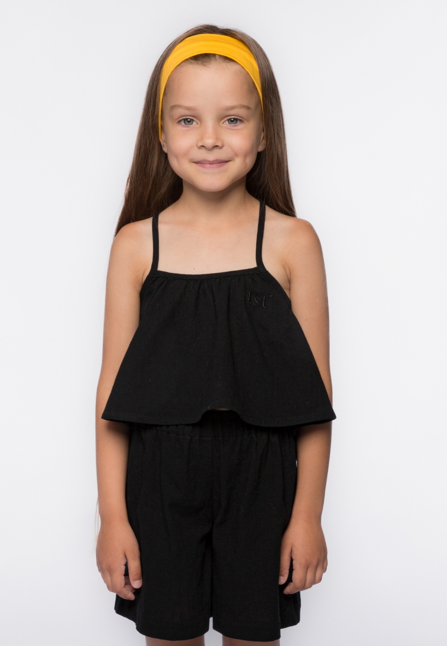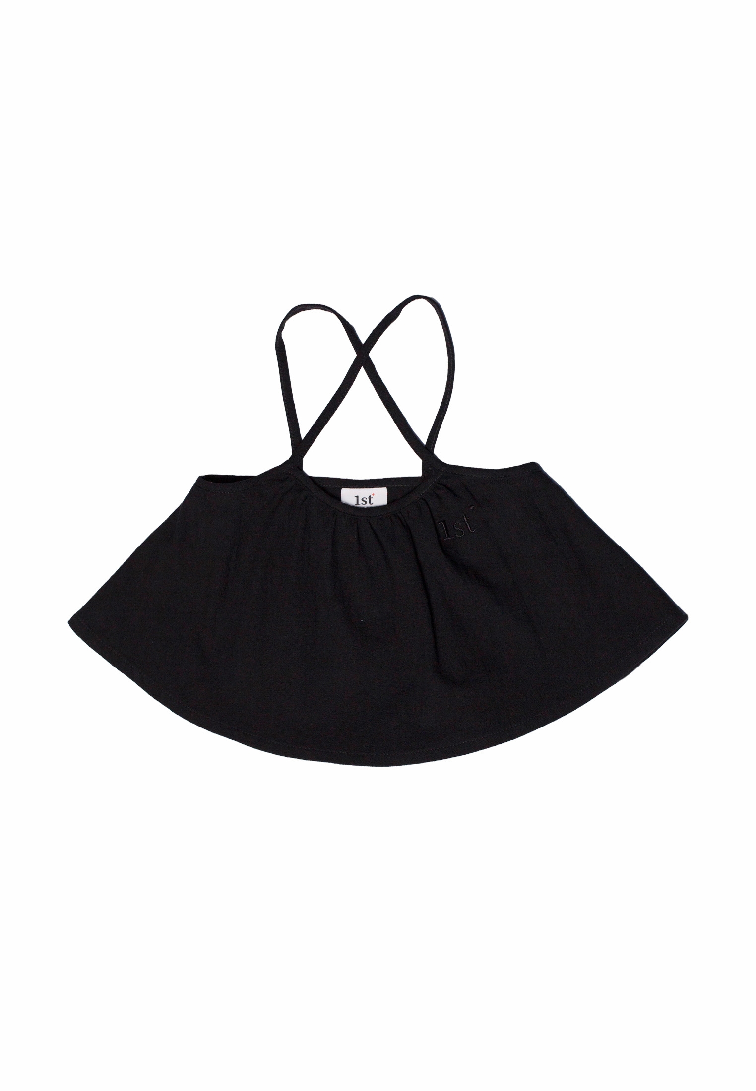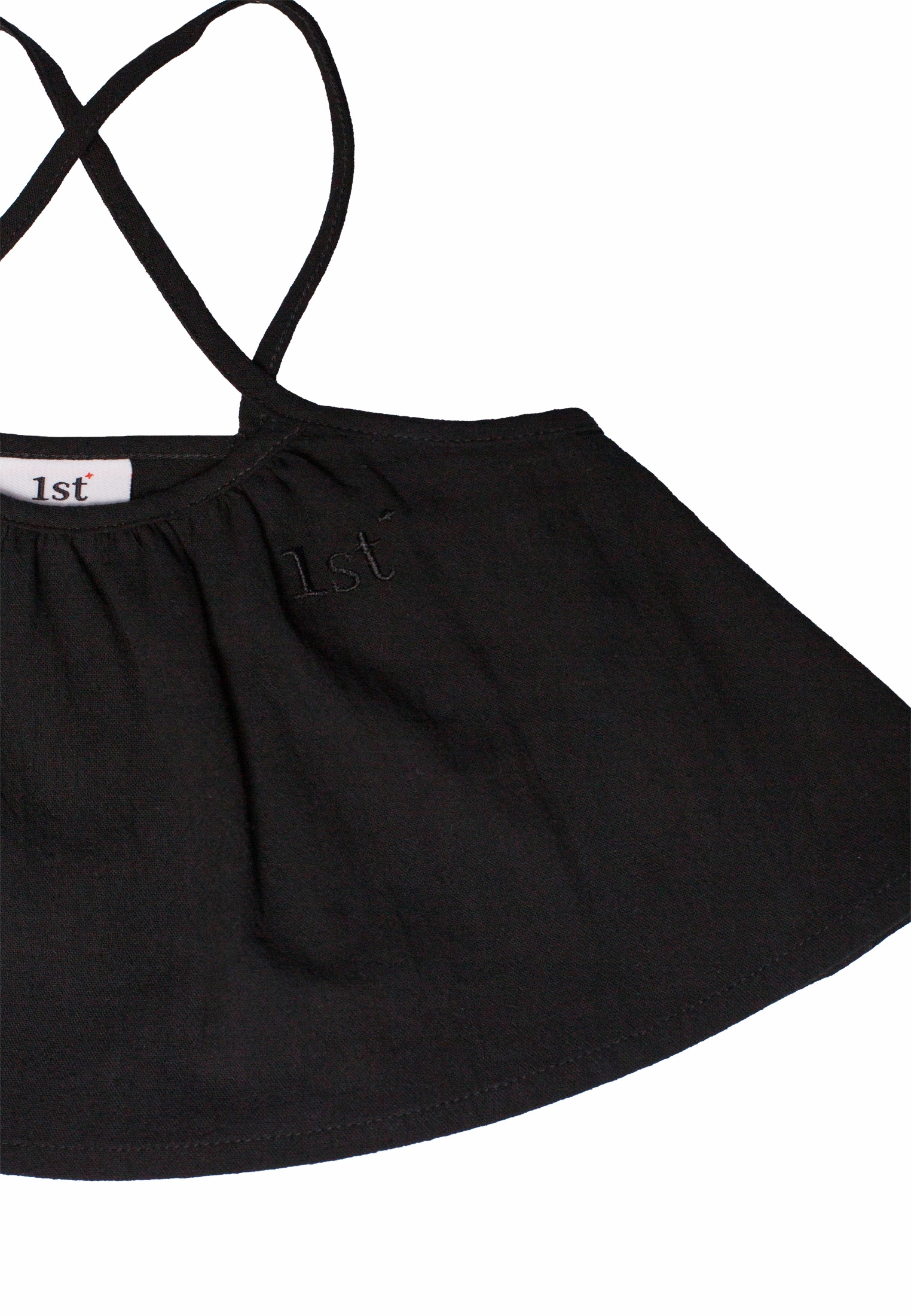 Невесомый топ на тонких бретелях выполнен из легкого хлопка и дополнен вышитым логотипом 1st. в цвет. Выполнен в голубом и черном цветах, а также имеет сдвоенный размер.