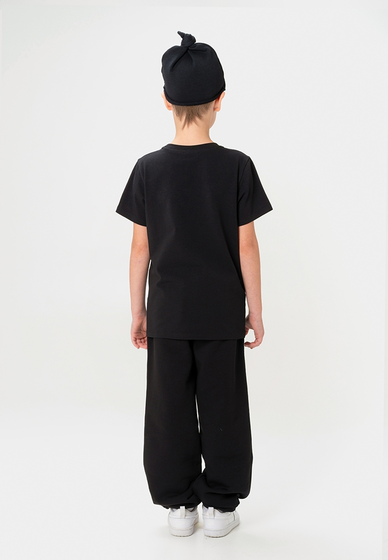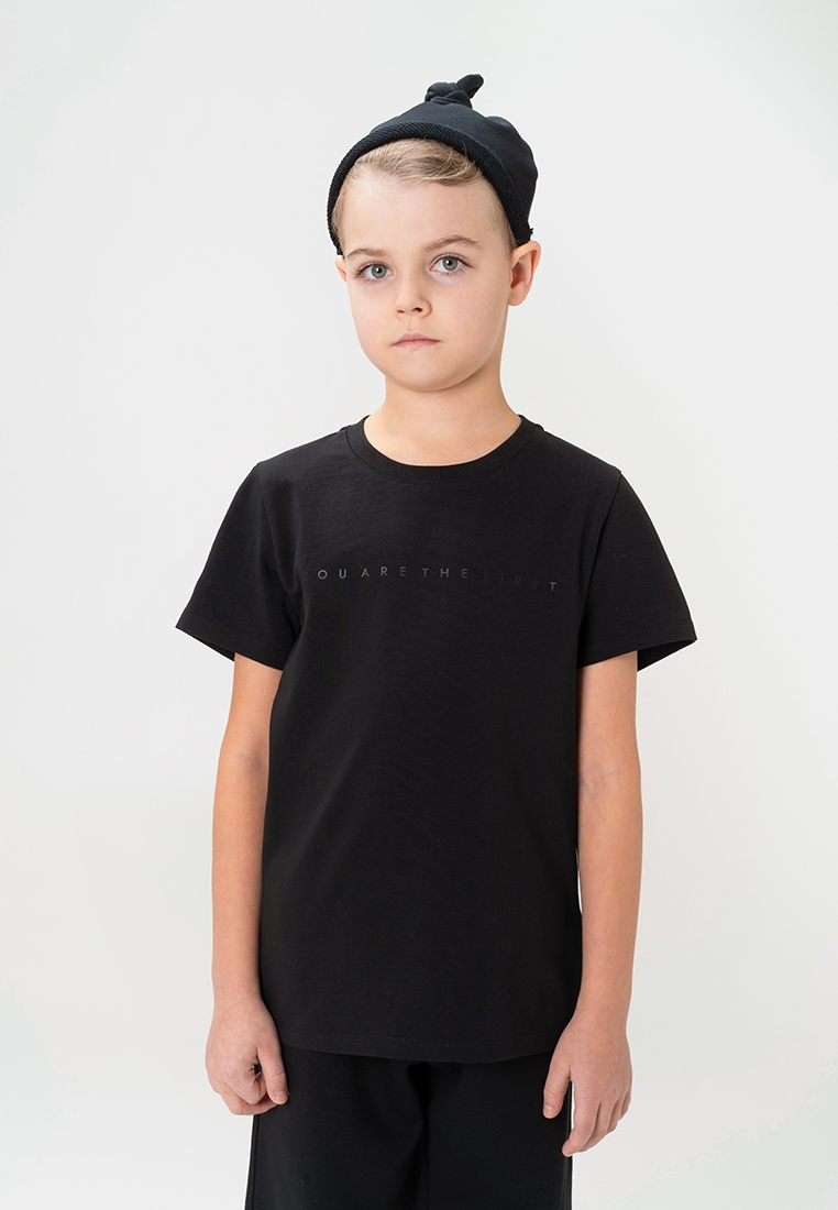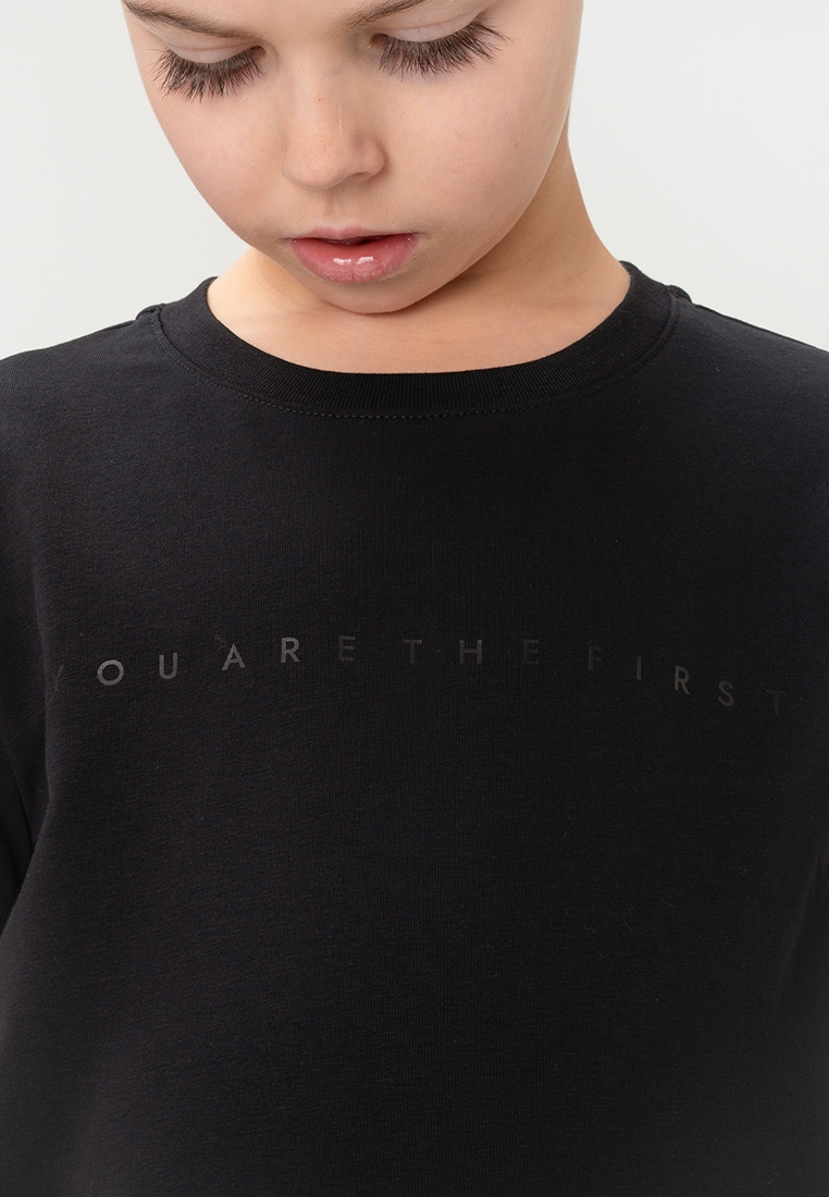 Однотонная базовая футболка в чёрном цвете прямого кроя для мальчика и девочки. Выполнена из премиального хлопка с добавлением эластана. Материал идеален в носке, не деформируется. Благодаря эластичной горловине футболку удобно снимать и надевать. На фронтальной части изделия расположен фирменный девиз бренда “YOU ARE THE FIRST”.