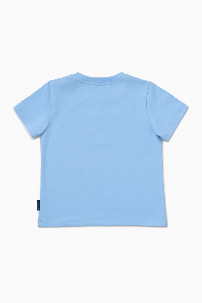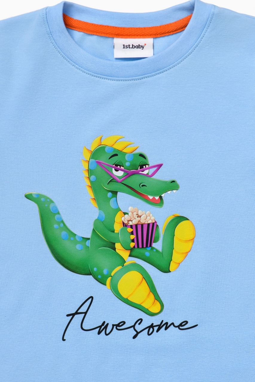 Базовая футболка в голубом цвете с ярким принтом динозавра.