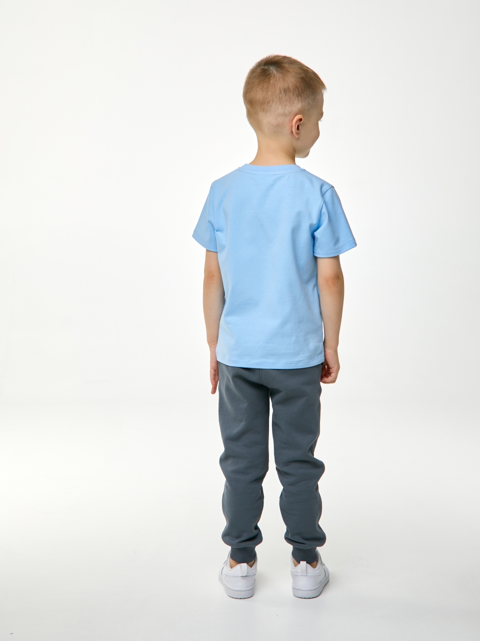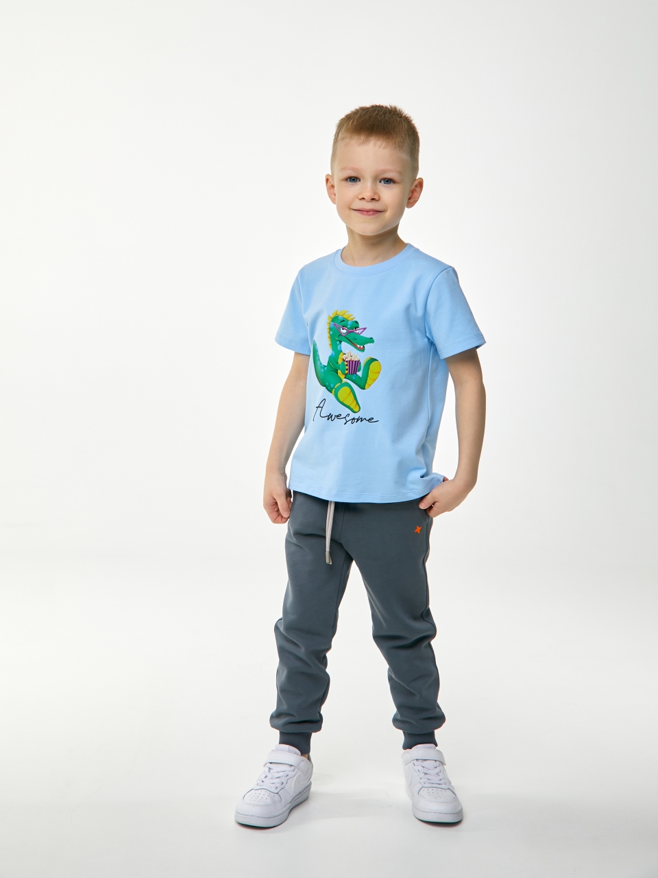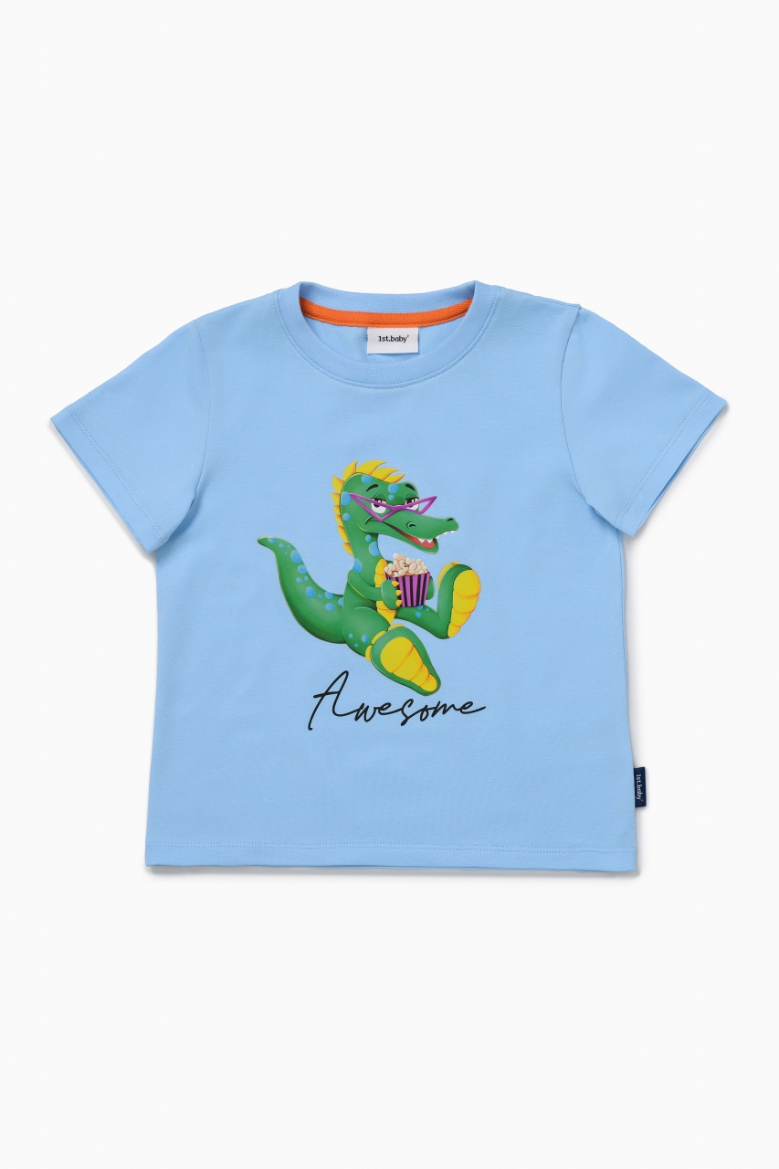 Однотонная базовая футболка в голубом цвете прямого кроя для мальчика. Выполнена из премиального хлопка с добавлением эластана. Материал идеален в носке, не деформируется. Благодаря эластичной горловине футболку удобно снимать и надевать. На фронтальной части изделия расположен яркий принт – динозавр с надписью “Awesome”.