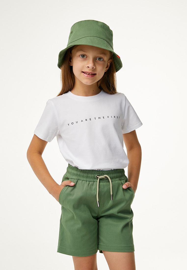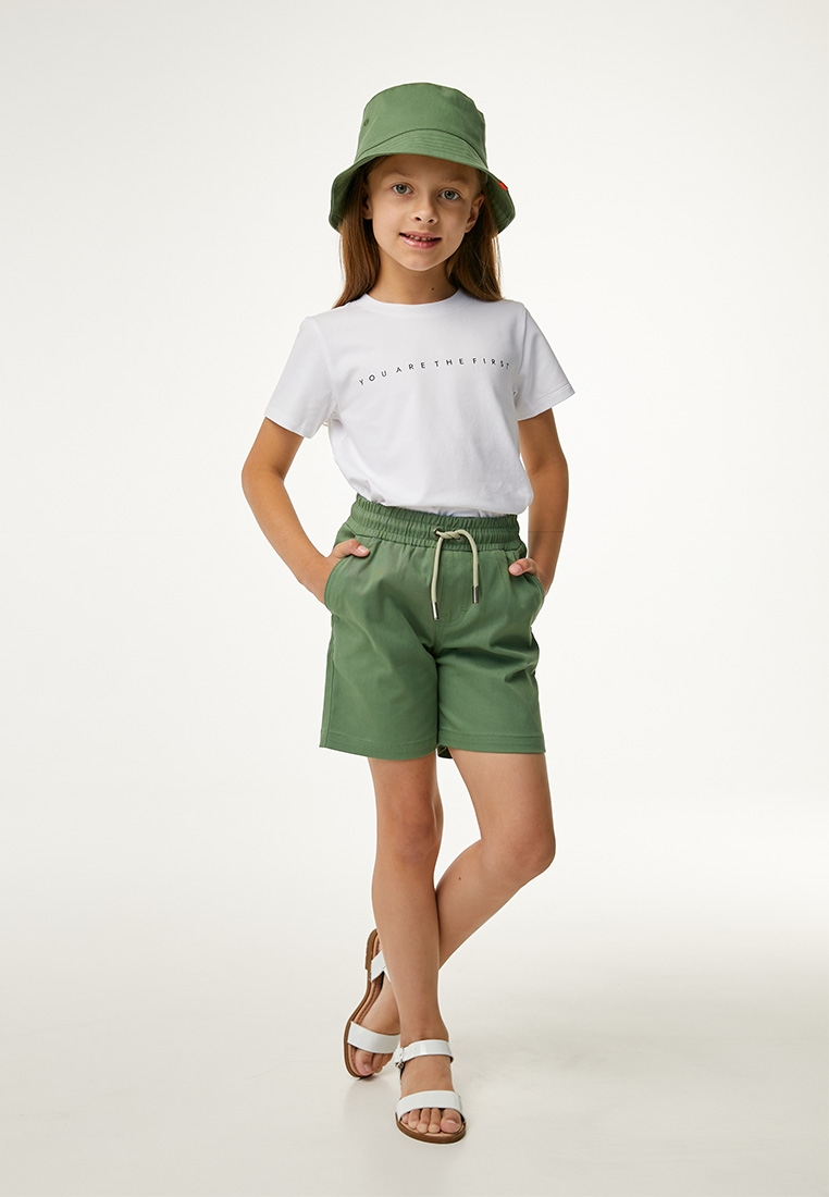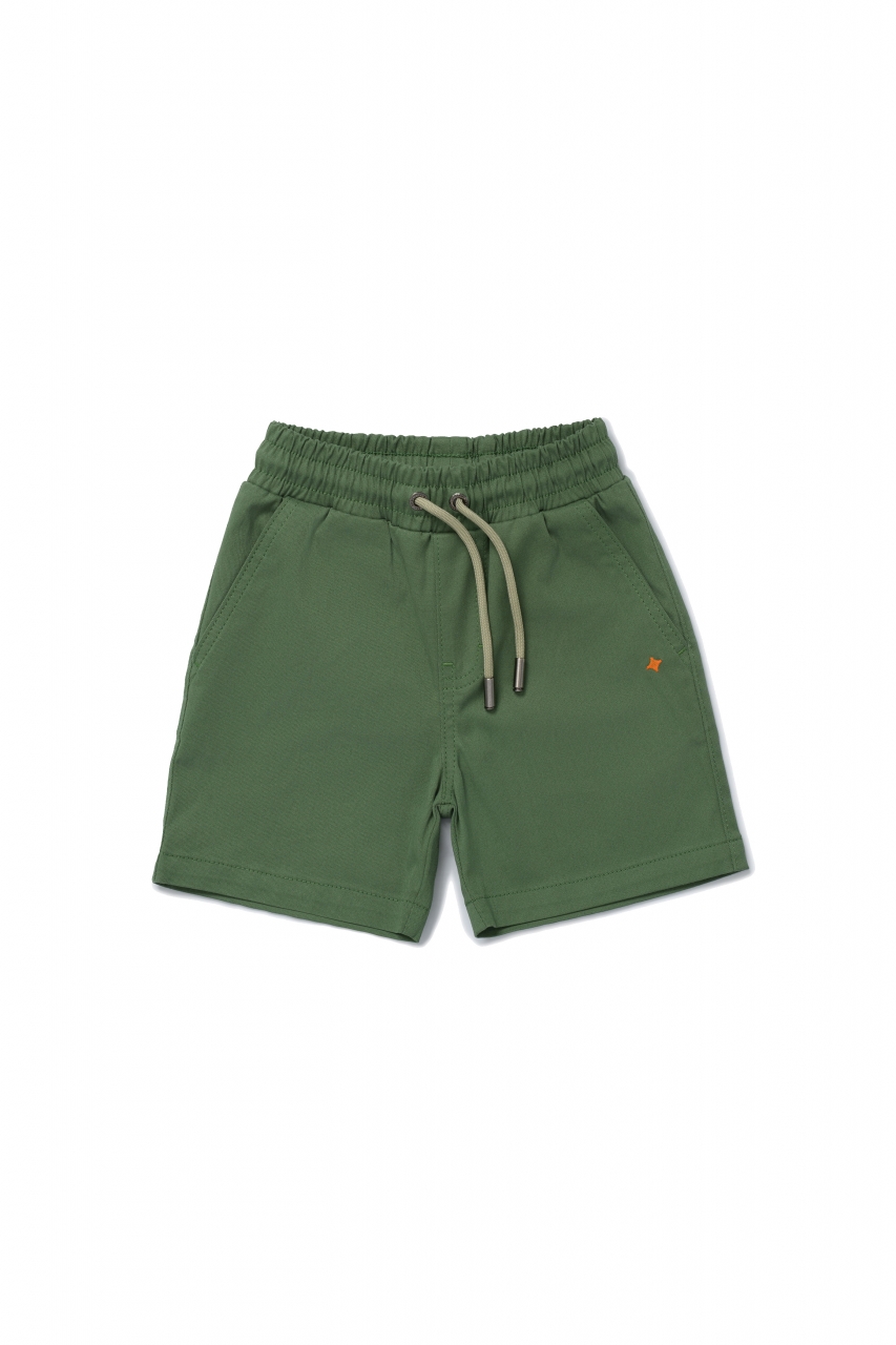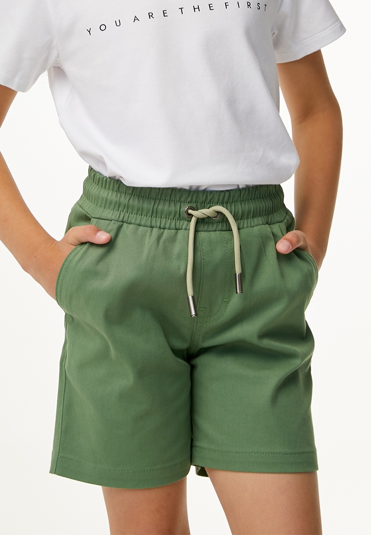 Однотонные базовые шорты выполнены из хлопкового твила с добавлением эластана. Шорты прямого кроя, подойдут как на мальчика, так и на девочку. Комфортный пояс с внутренней резинкой и шнуром для регулировки объема. Два кармана по бокам и один накладной карман сзади изделия, который дополнен жаккардом. Спереди на изделии вышита звезда оранжевым цветом.