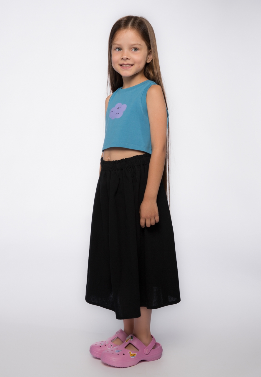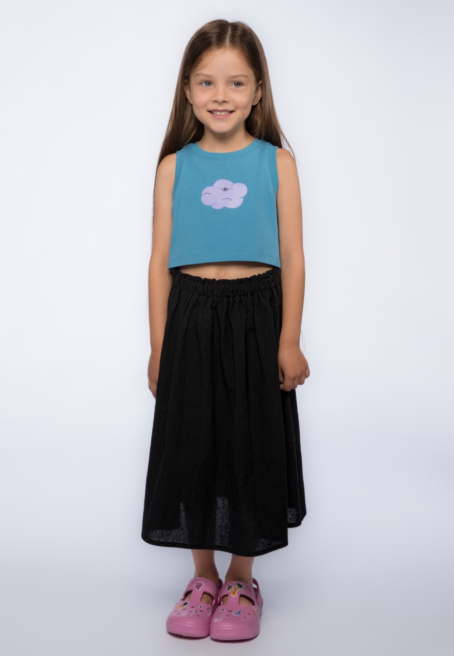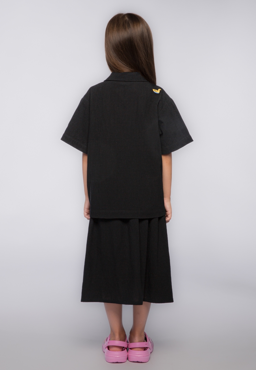 Капсула для путешествий дополнена и моделями для девочек. Так что по настроению шорты или кюлоты можно сменить на юбку миди – и вот ты уже главная принцесса пляжа или вечерних танцев. Модель представлена в черном и голубом цветах и дополнена вышивкой 1st. в цвет, имеет сдвоенный размер.